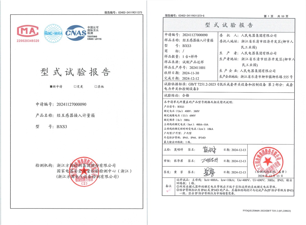 型式试验报告(202412):BXS3 400A~10A经互感器接入计量箱(点击下载)