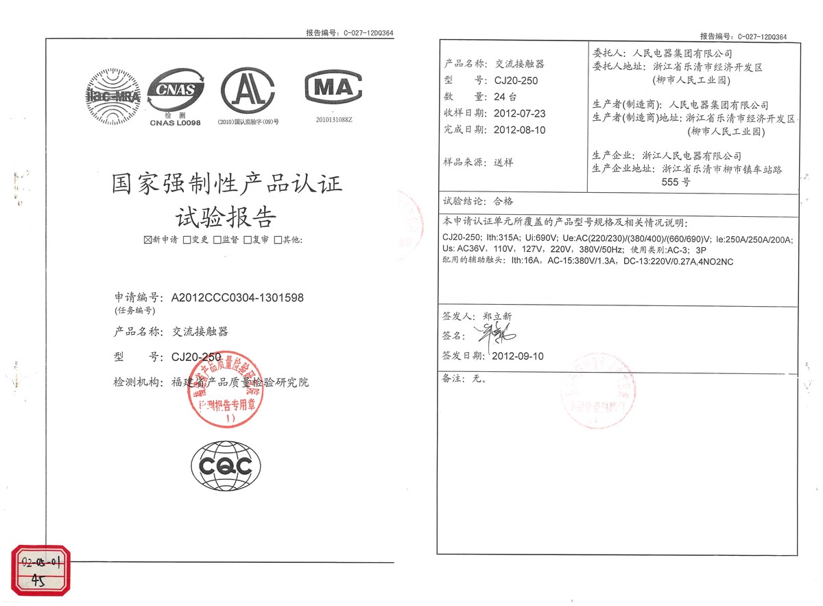CCC试验报告(201209):CJ20-250交流接触器(点击下载)