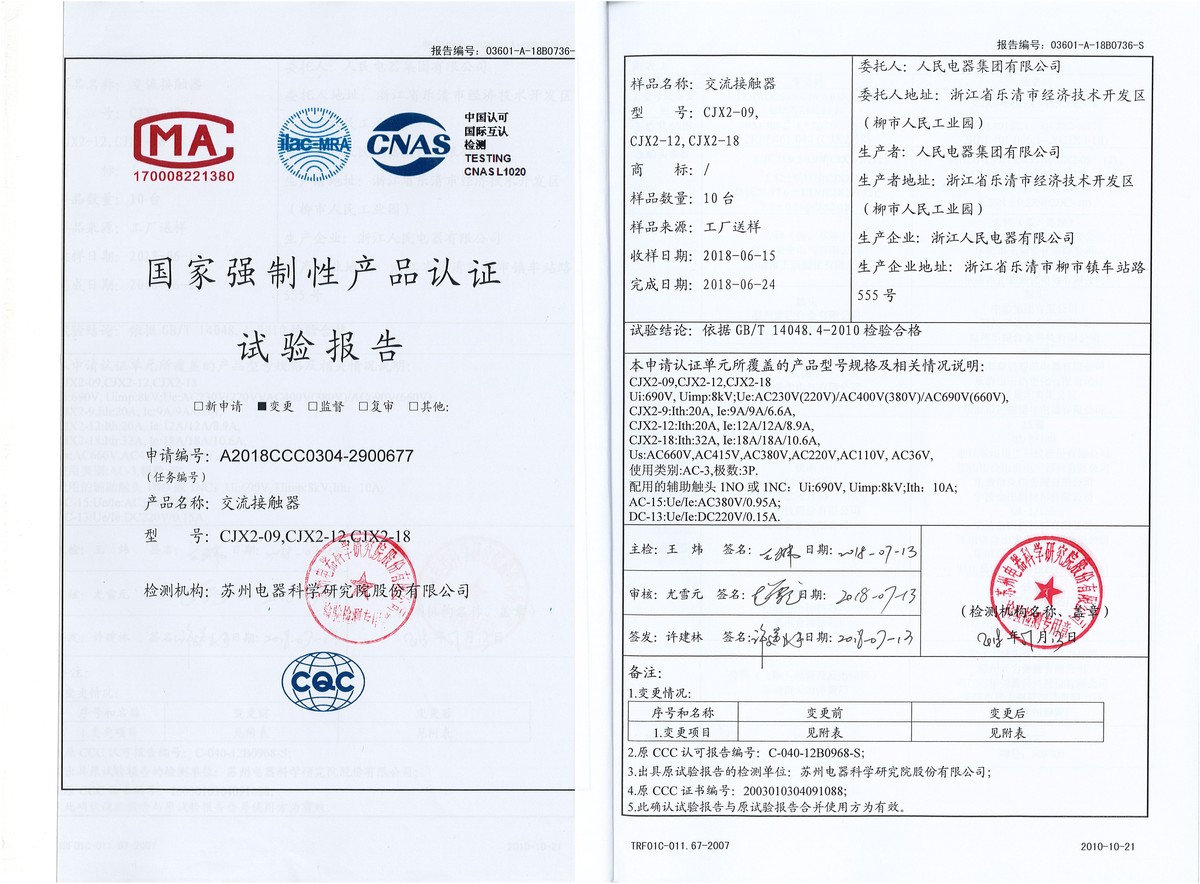 CCC试验报告(201807):CJX2-09,CJX2-12,CJX2-18交流接触器(点击下载)