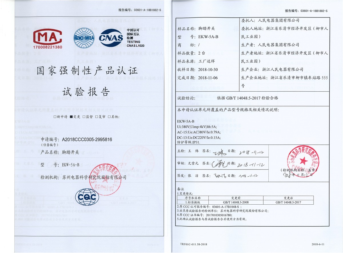 CCC试验报告(201811):EKW-5A-B脚踏开关(点击下载)