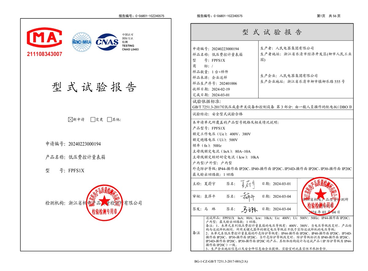 型式试验报告(202403):FPFS1X 80A~10A 低压费控计量表箱(点击下载)