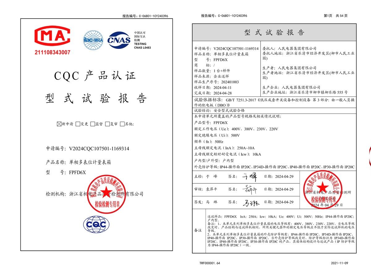 CQC试验报告(202404):FPFD6X 单相多表位计量表箱(点击下载)