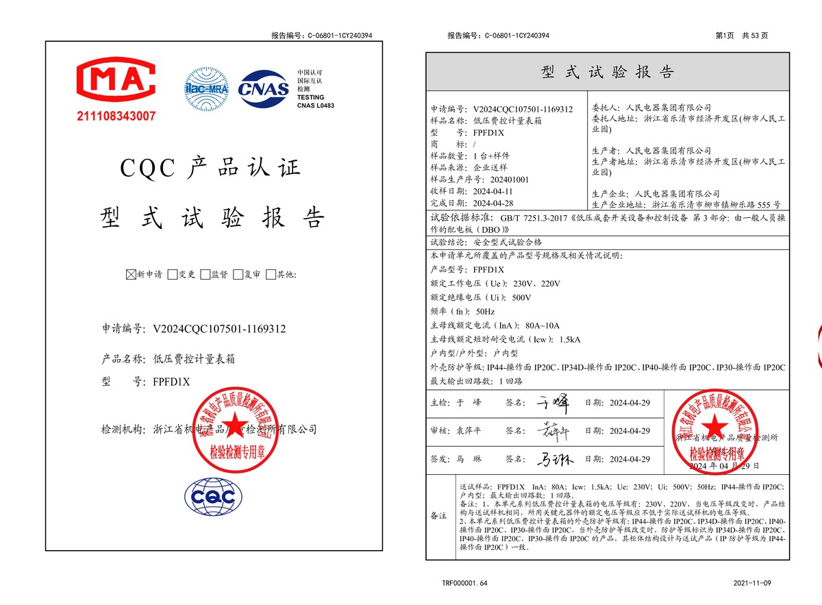 CQC试验报告(202404):FPFD1X 低压费控计量表箱(点击下载)