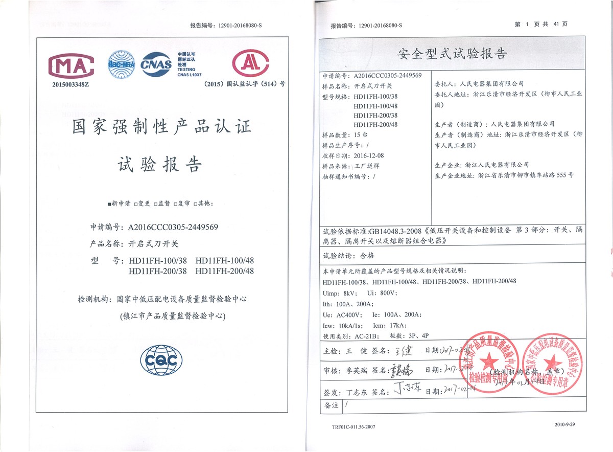 CCC试验报告(201701):HD11FH-100 HD11FH-200开启式刀开关(点击下载)