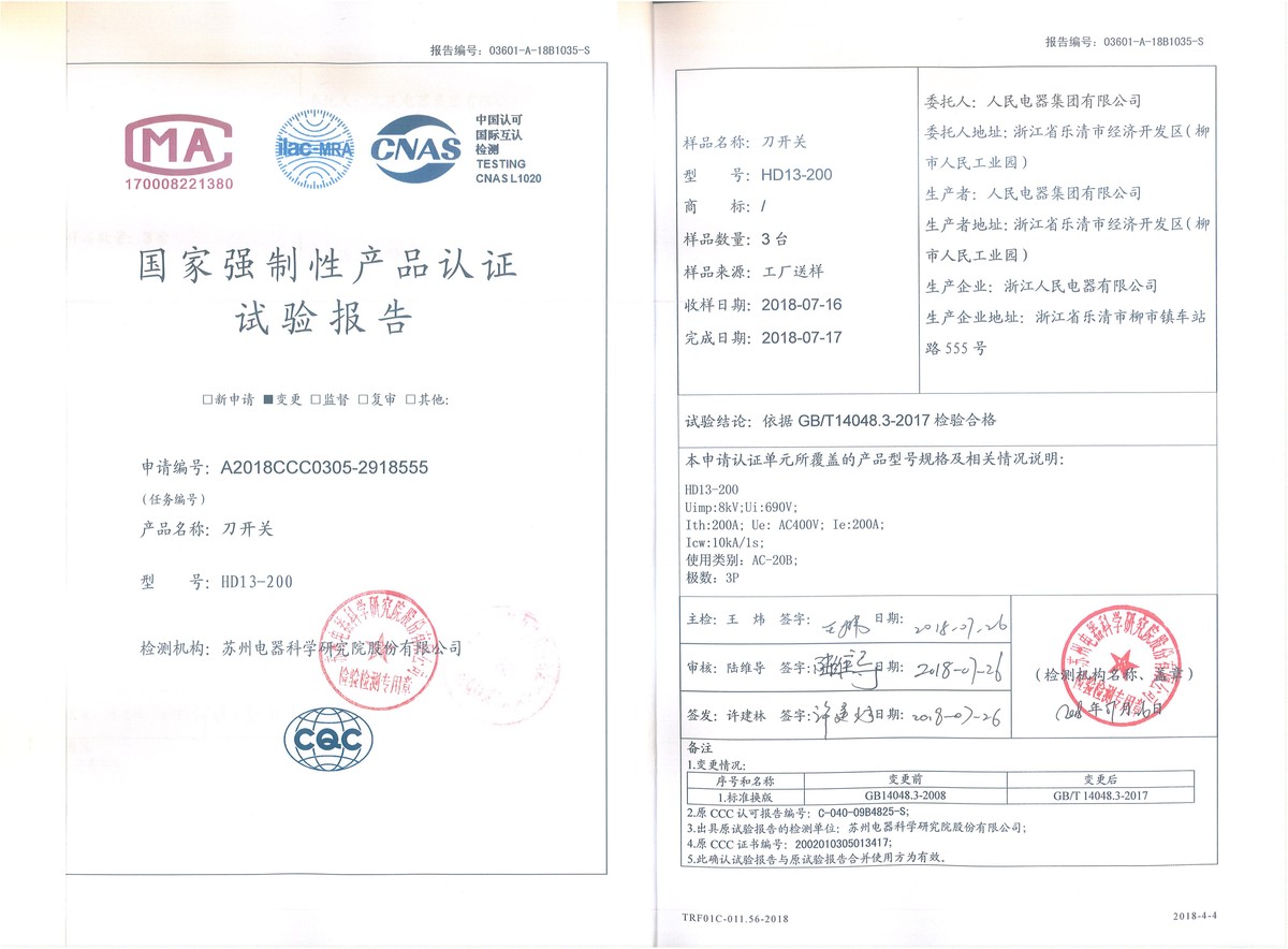 CCC试验报告(201807):HD13-200刀开关(点击下载)