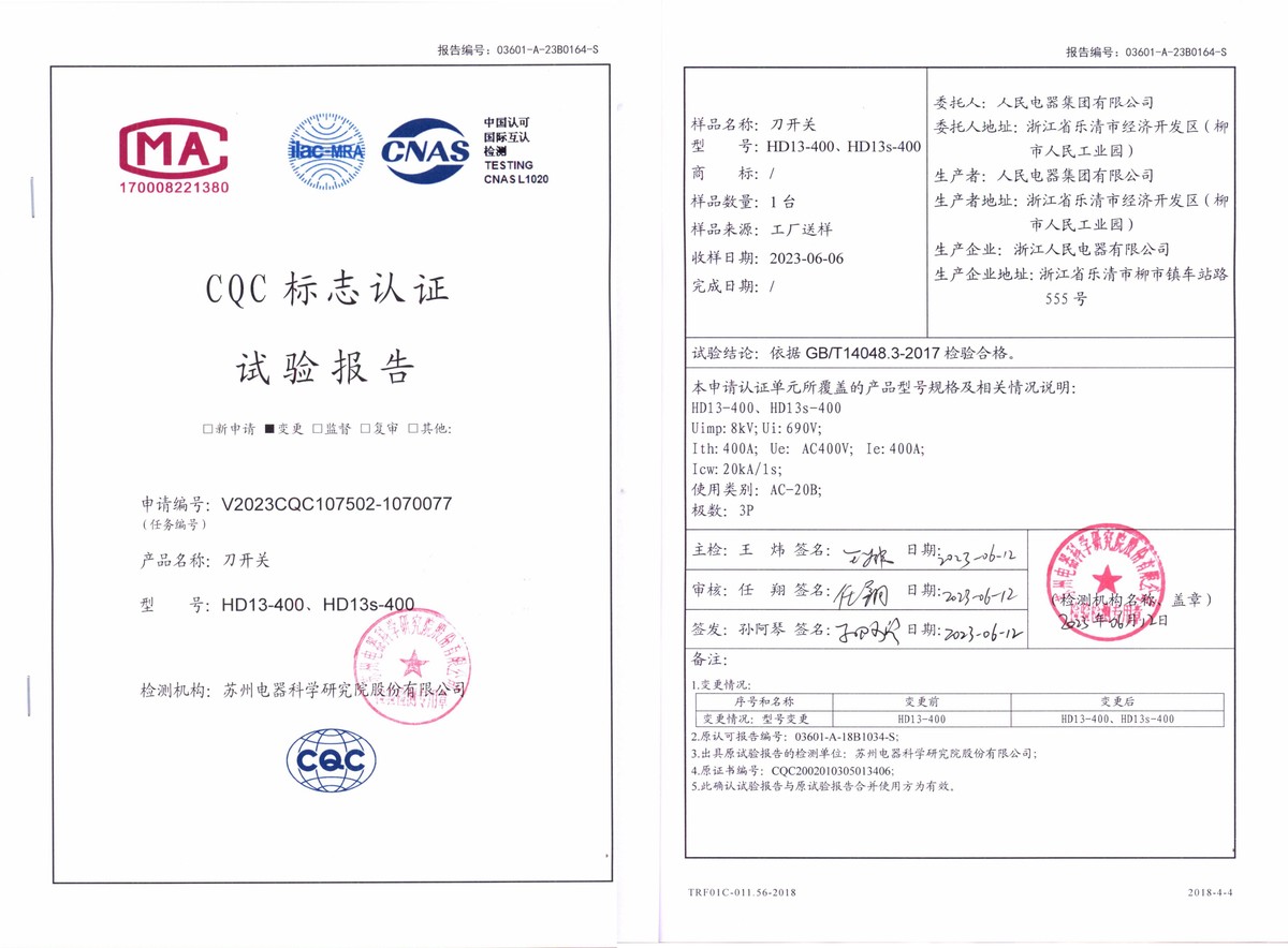 CQC试验报告(202306):HD13-400,HD13s-400刀开关(点击下载)