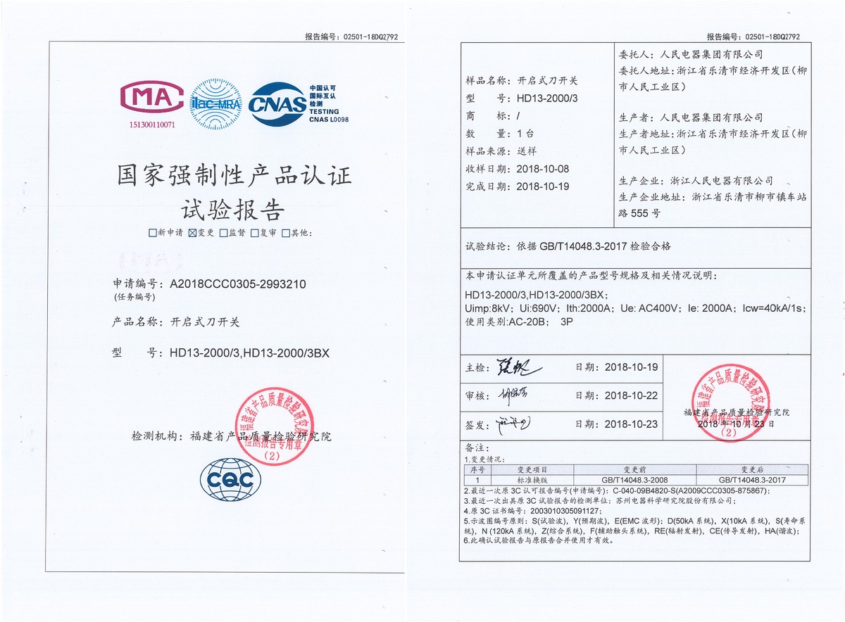 CCC试验报告(201810):HD13-2000刀开关(点击下载)