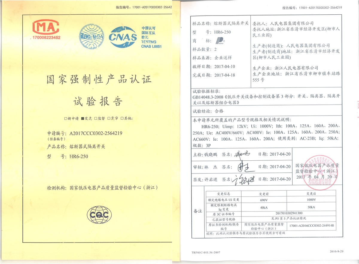 CCC试验报告(201704):HR6-250熔断器式隔离开关(点击下载)