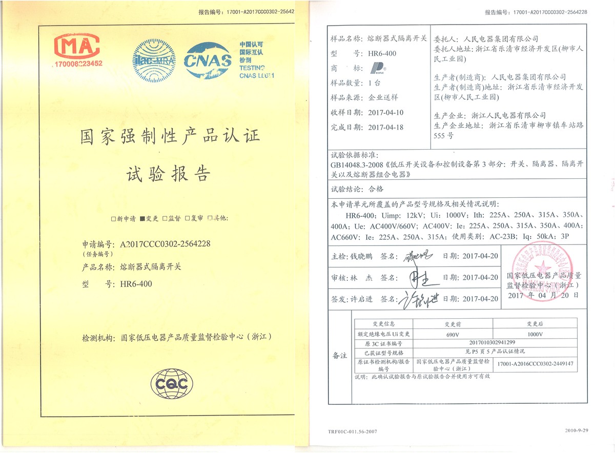CCC试验报告(201704):HR6-400熔断器式隔离开关(点击下载)