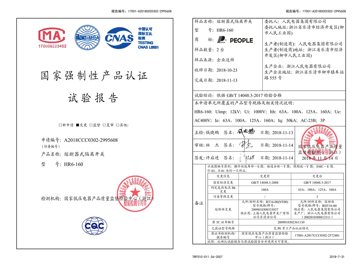 CCC试验报告(201811):HR6-160熔断器式隔离开关(点击下载)