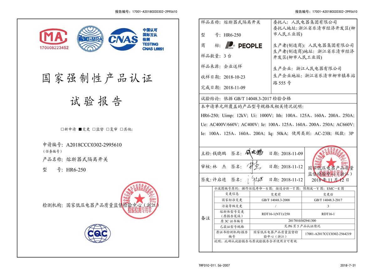 CCC试验报告(201811):HR6-250熔断器式隔离开关(点击下载)