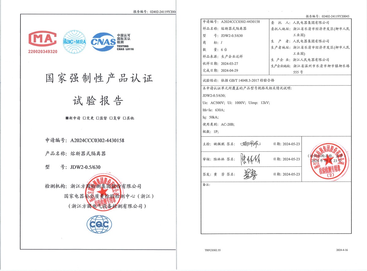 CCC试验报告(202405):JDW2-0.5/630熔断器式隔离器(点击下载)