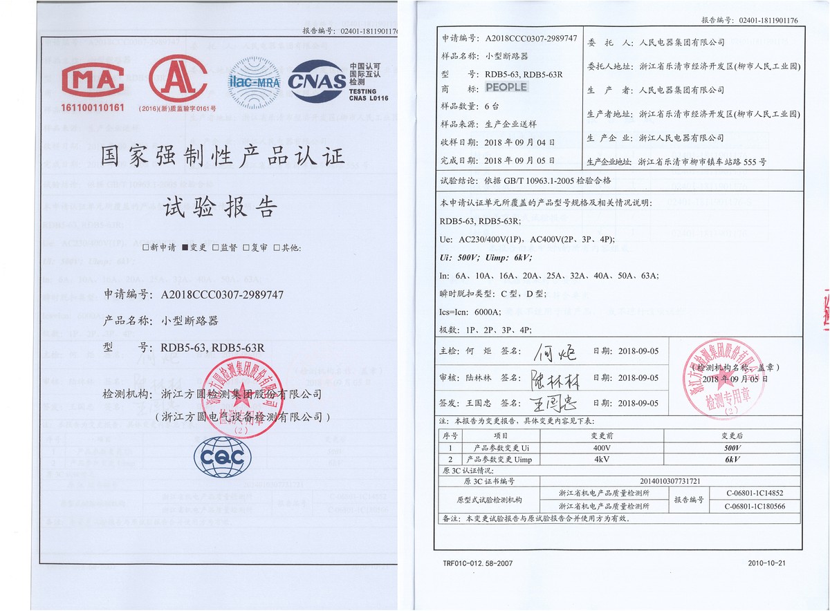 CCC试验报告(201809):RDB5-63,RDB5-63R小型断路器(点击下载)
