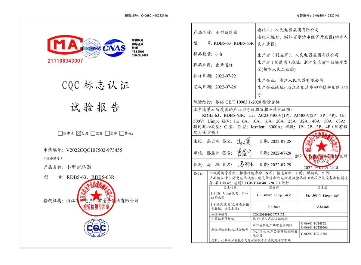 CQC试验报告(202207):RDB5-63,RDB5-63R小型断路器(点击下载)