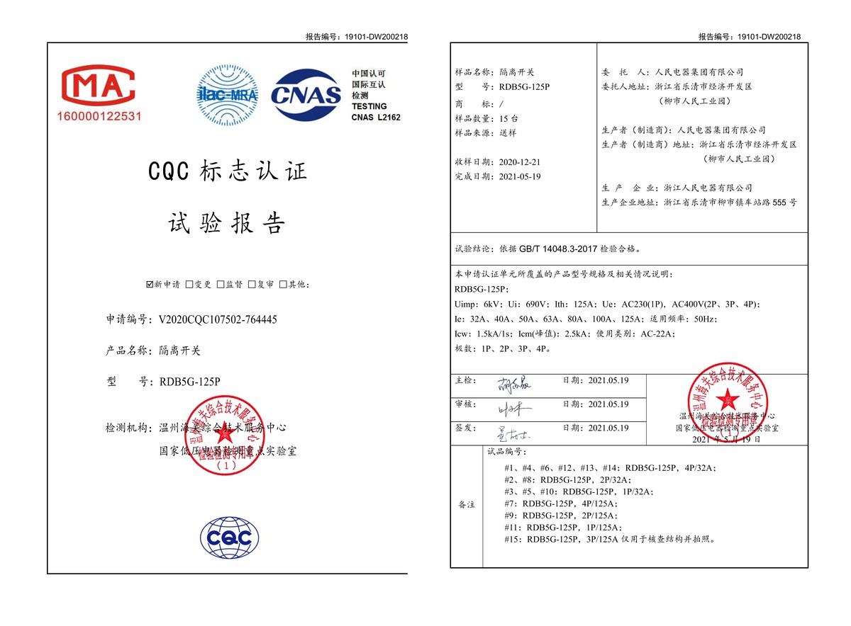 CQC试验报告(202105):RDB5G-125P隔离开关(点击下载)
