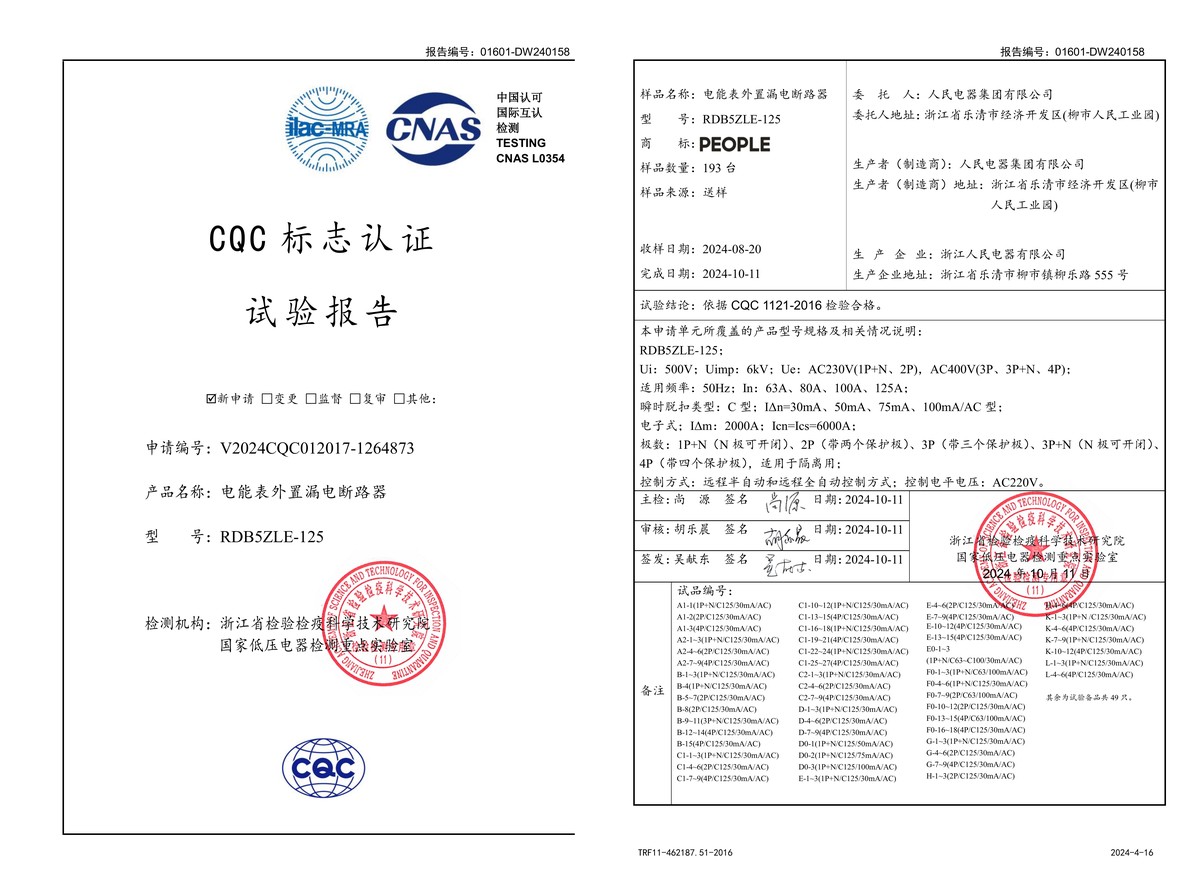 CQC试验报告(202410):RDB5ZLE-125电能表外置漏电断路器(点击下载)