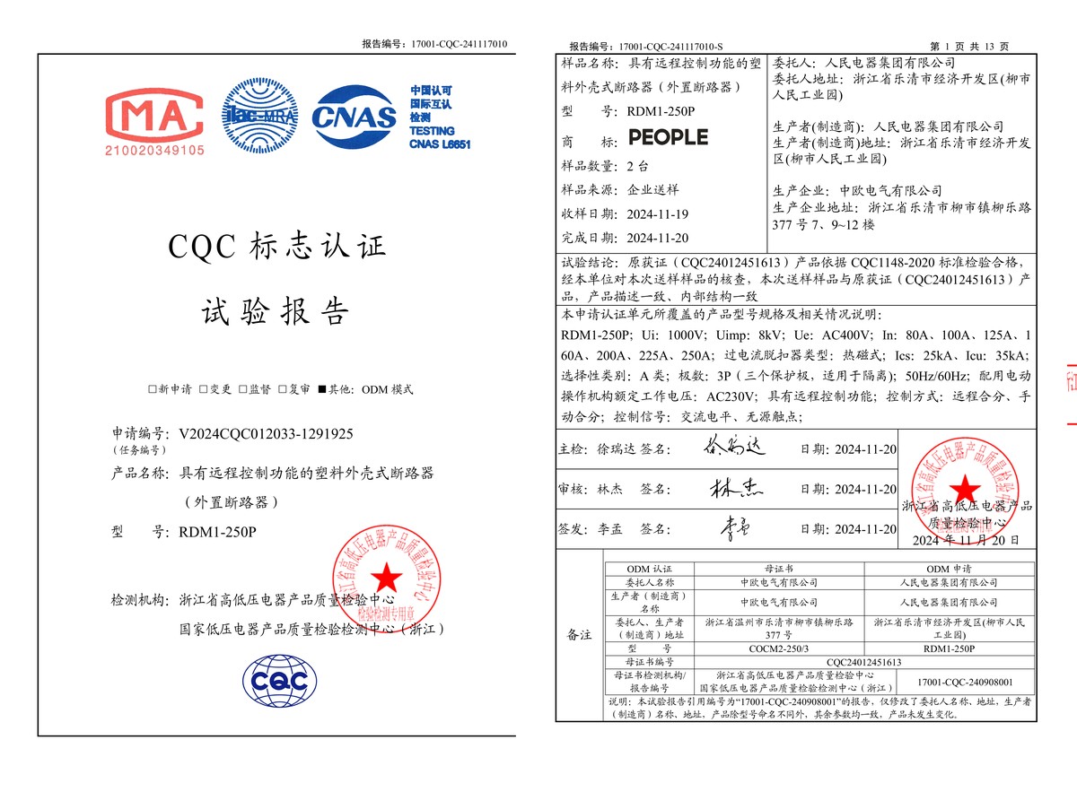 CQC试验报告(202411):RDM1-250P具有远程控制功能的塑料外壳式断路器 (外置断路器)(点击下载)