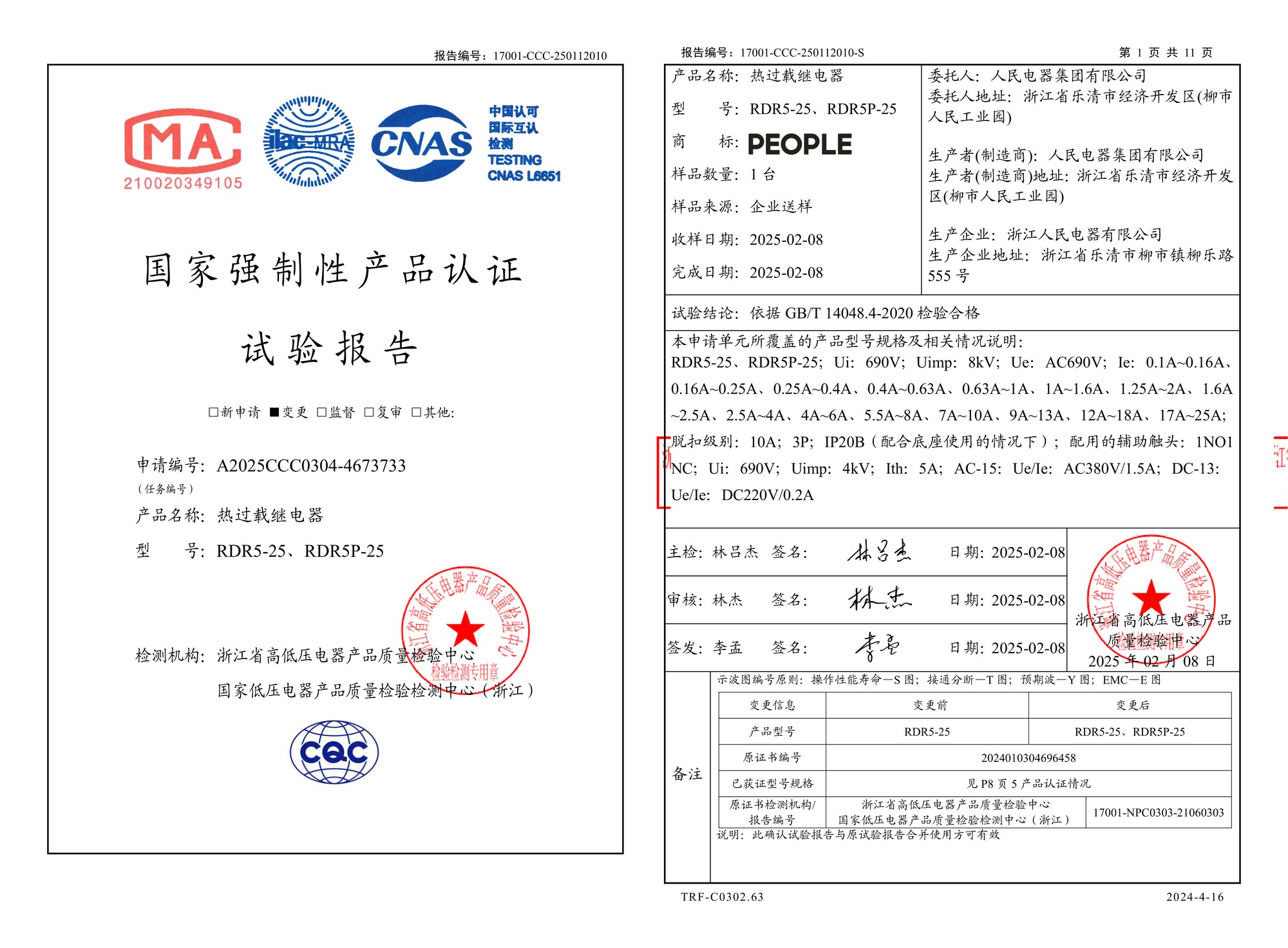CCC试验报告(202502):RDR5-25,RDR5P-25热过载继电器(点击下载)