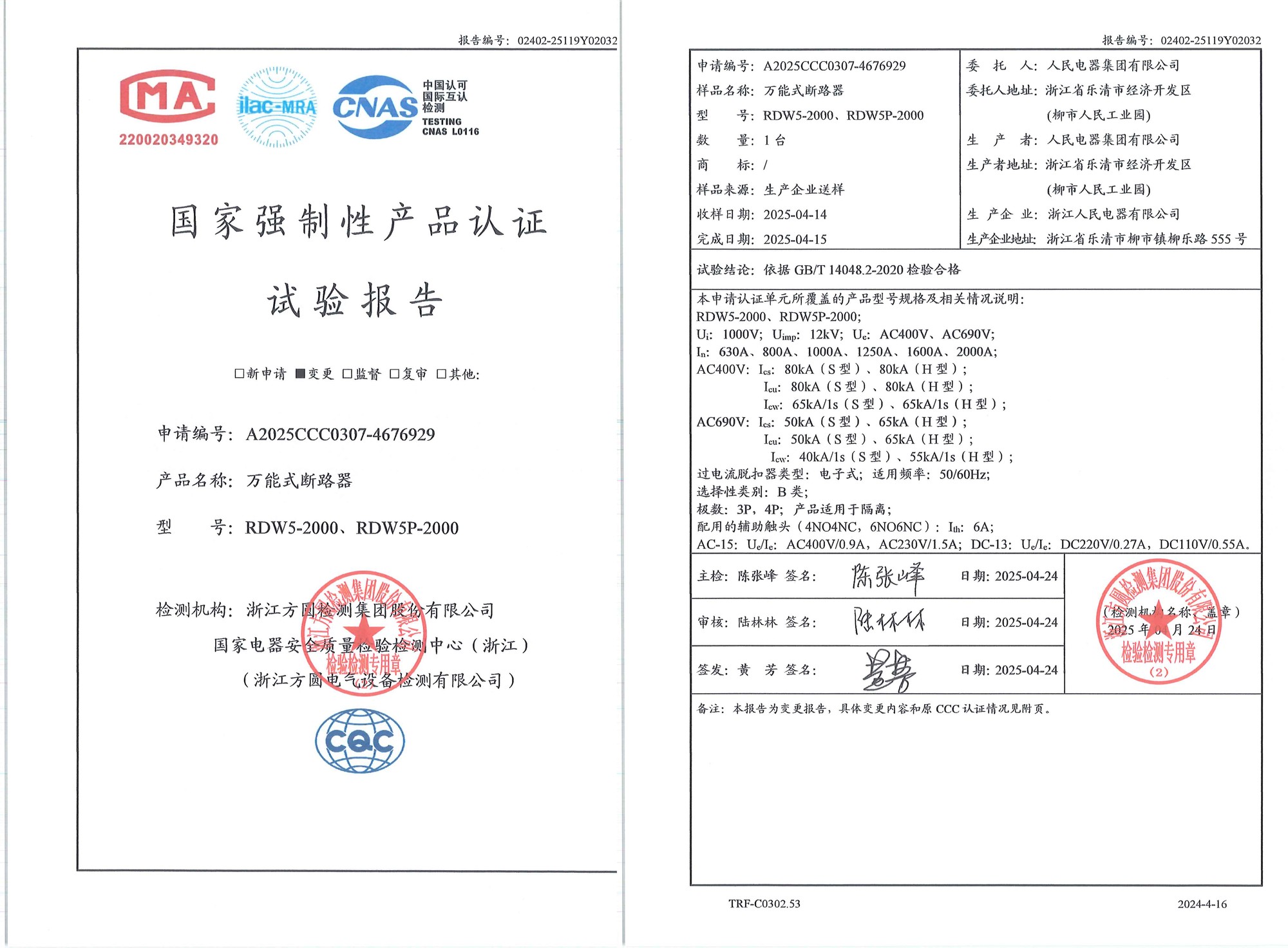 CCC试验报告(202504):RDW5-2000,RDW5P-2000万能式断路器(点击下载)