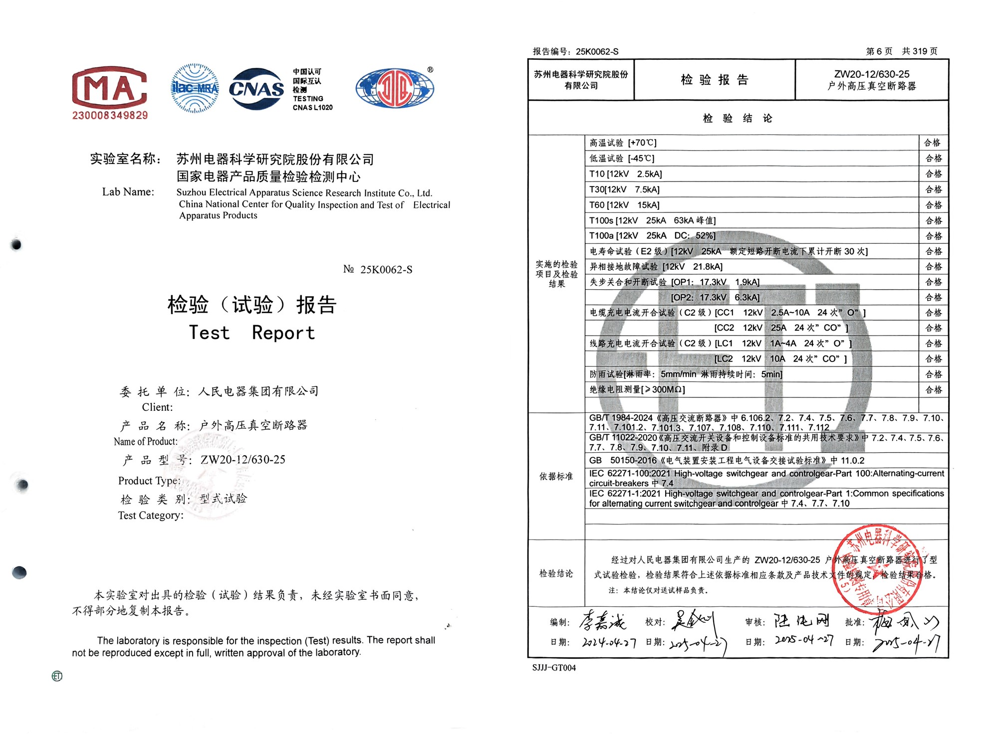 检验(试验)报告(202504):ZW20-12/630-25 户外高压真空断路器(点击下载)