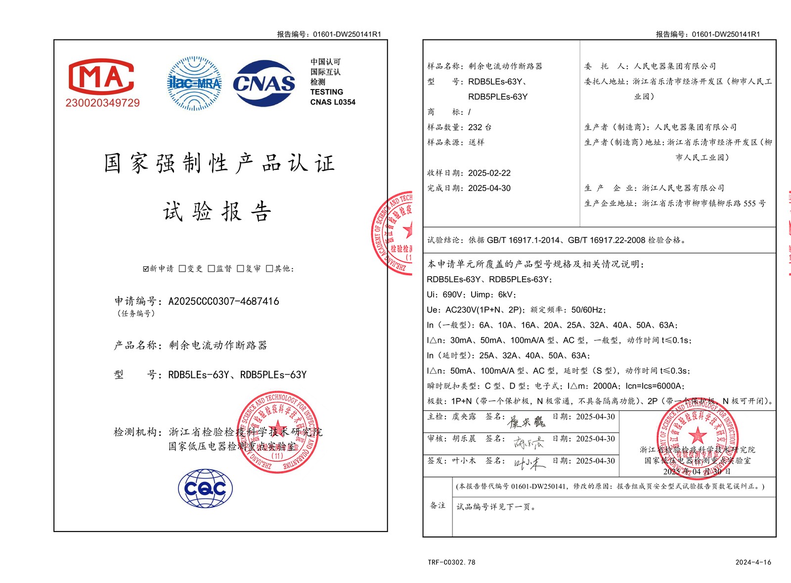 CCC试验报告(202504):RDB5LEs-63Y,RDBP5LEs-63Y剩余电流动作断路器(点击下载)