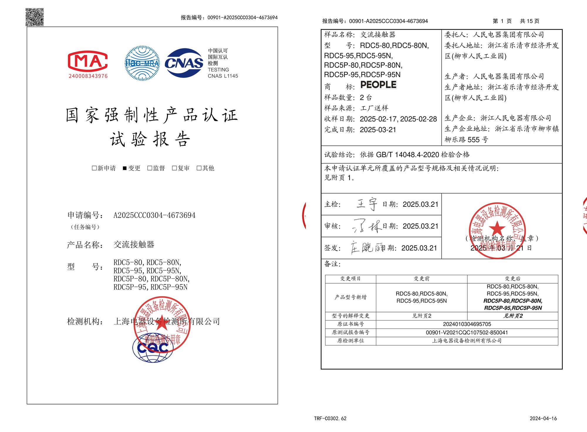 CCC试验报告(202503):RDC5-80,RDC5-80N,RDC5-95,RDC5-95N,RDC5P-80,RDC5P-80N,RDC5P-95,RDC5P-95N交流接触器(点击下载)
