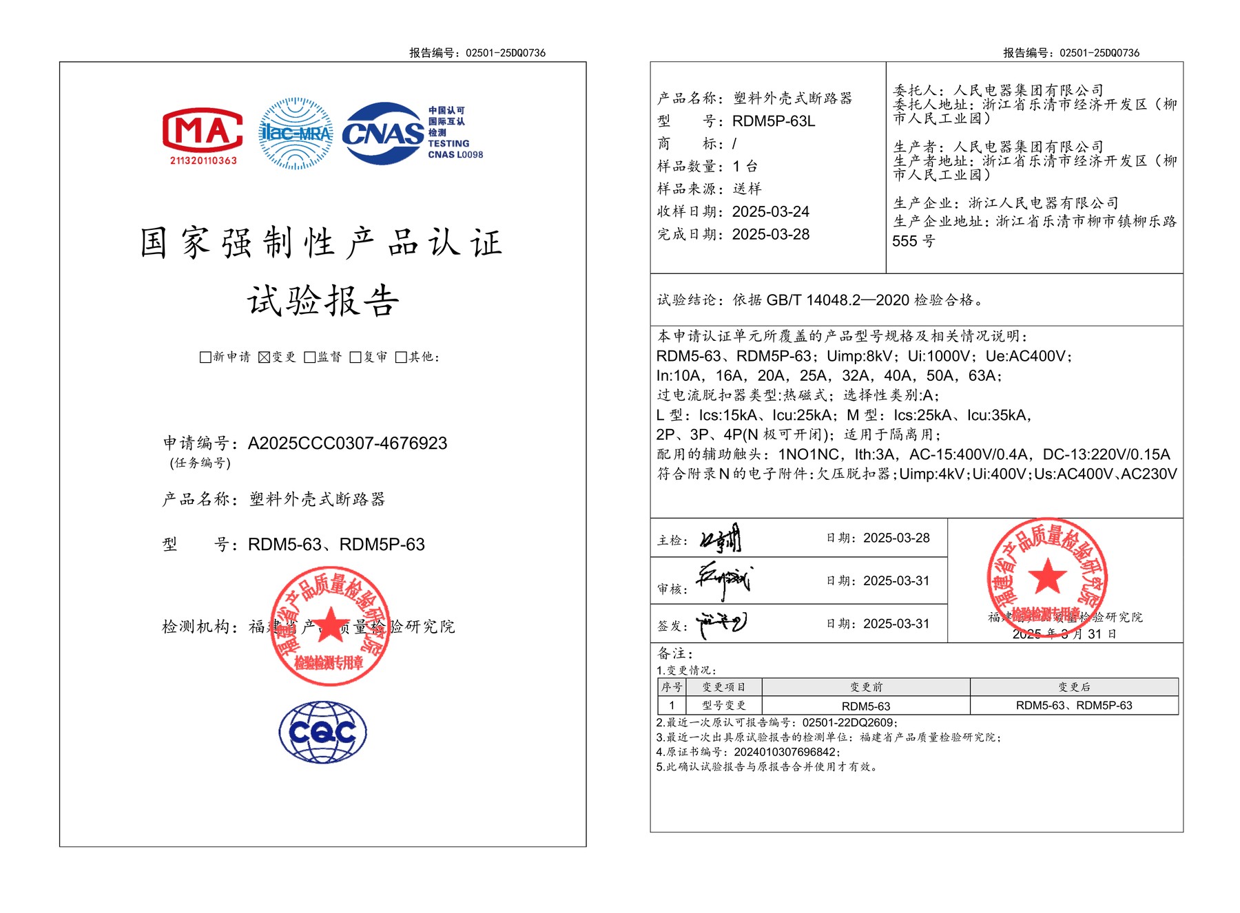 CCC试验报告(202505):RDM5-63,RDM5P-63塑料外壳式断路器(点击下载)