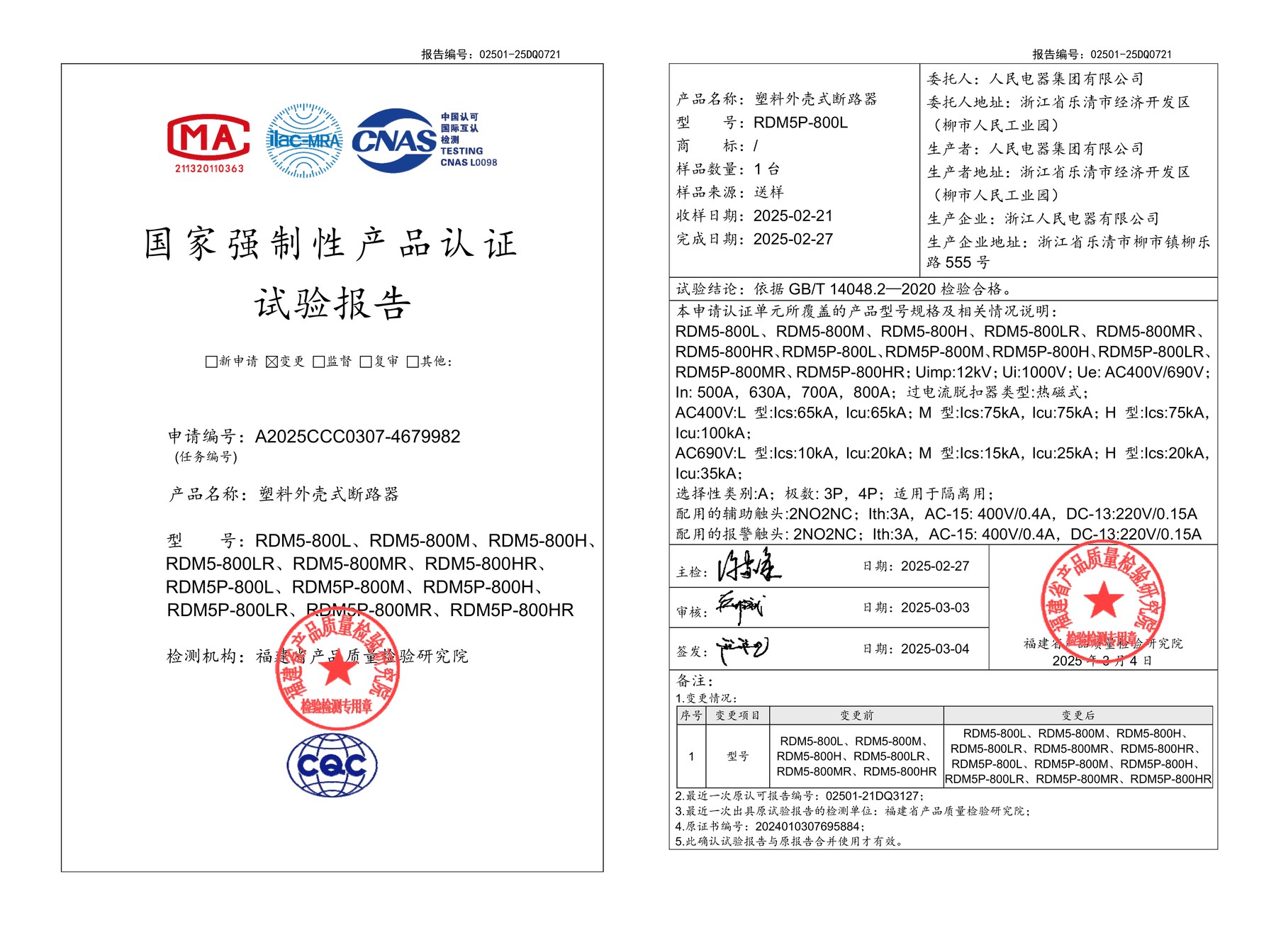 CCC试验报告(202505):RDM5-800,RDM5P-800塑料外壳式断路器(点击下载)