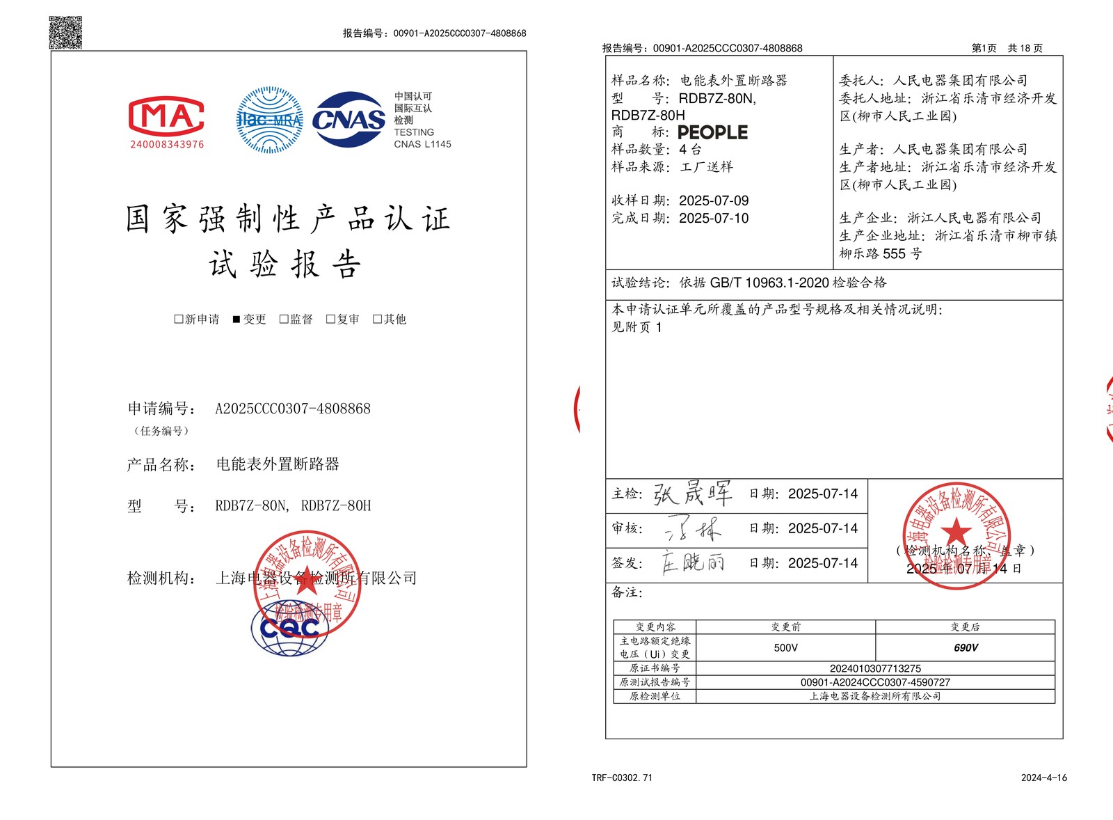 CCC试验报告(202507):RDB7Z-80N,RDB7Z-80H电能表外置断路器(点击下载)