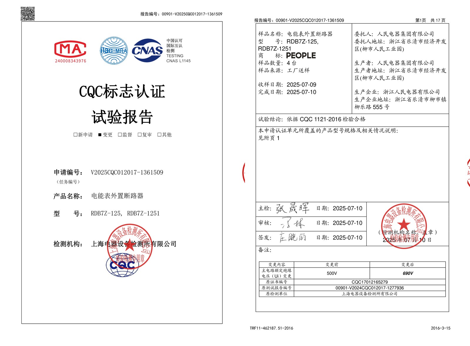 CQC试验报告(202507):RDB7Z-125,RDB7Z-1251电能表外置断路器(点击下载)