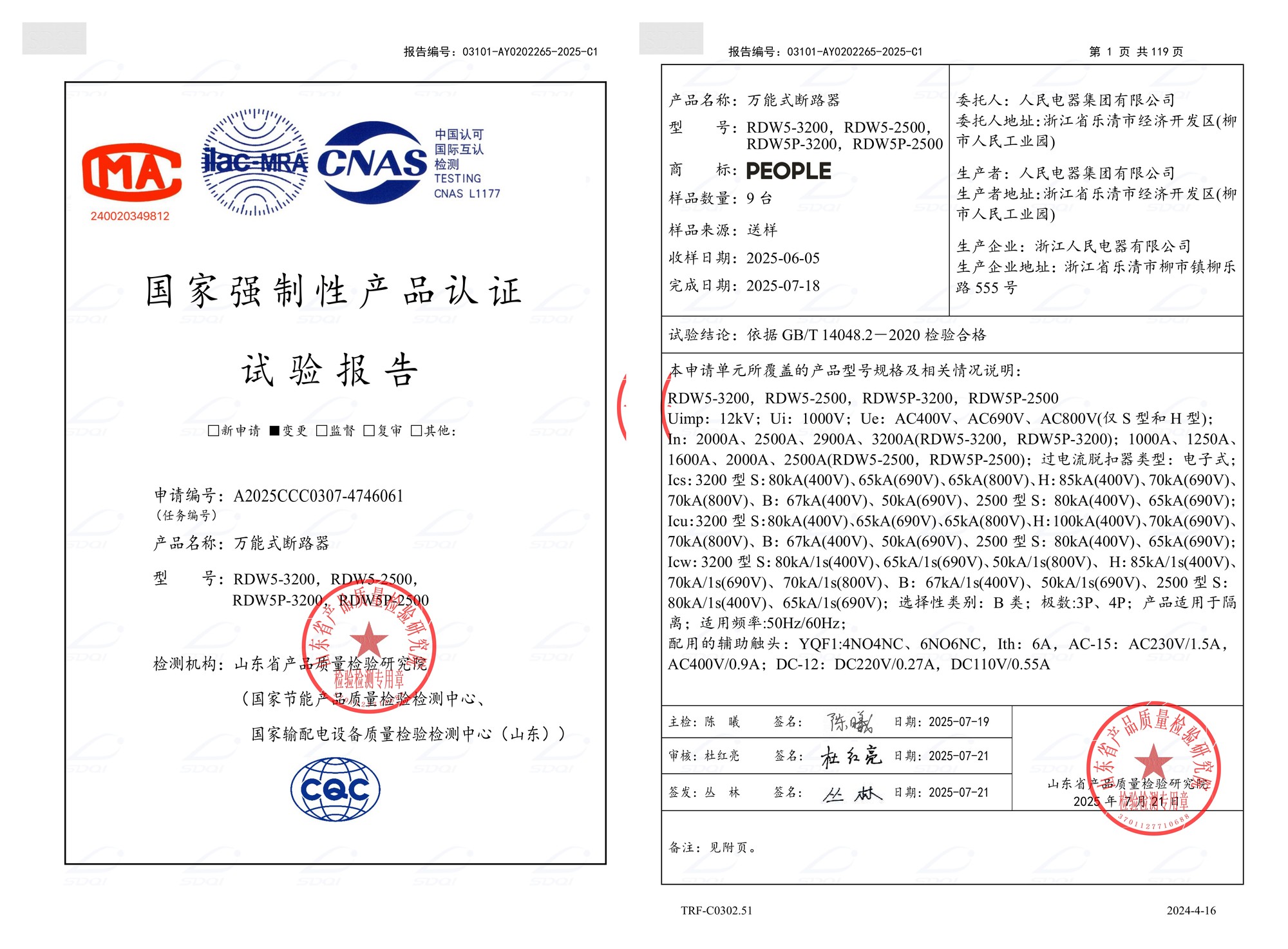 CCC试验报告(202507):RDW5-3200,RDW5-2500,RDW5P-3200,RDW5P-2500万能式断路器(点击下载)
