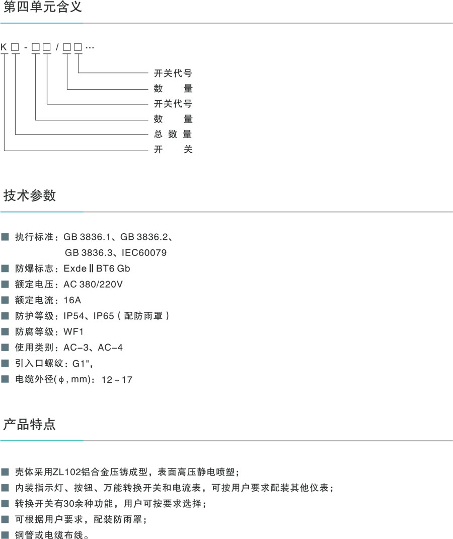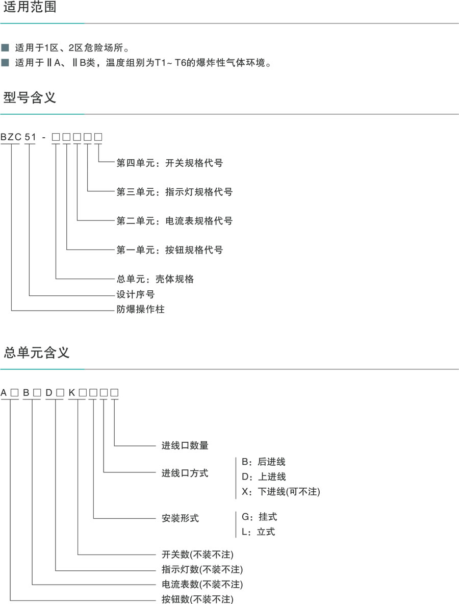 适用于1区、2区危险场所。 适用于ⅡA、ⅡB类,温度组别为T1~T6的爆炸性气体环境。