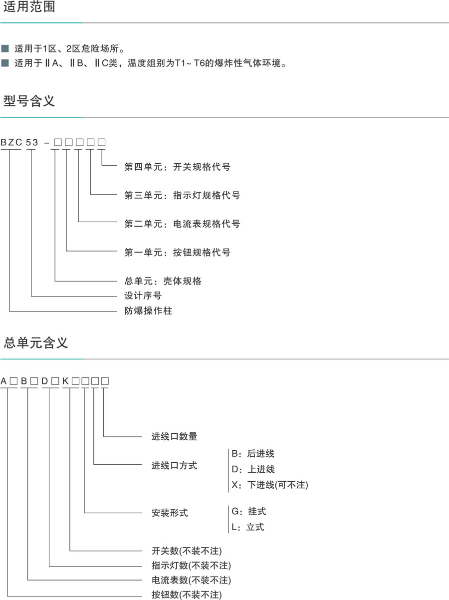 适用于1区、2区危险场所。 适用于ⅡA、ⅡB类、ⅡC类,温度组别为T1~T6的爆炸性气体环境。
