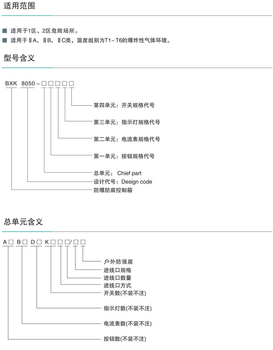 适用于1区、2区危险场所。 适用于ⅡA、ⅡB、ⅡC类,温度组别为T1~T6的爆炸性气体环境。