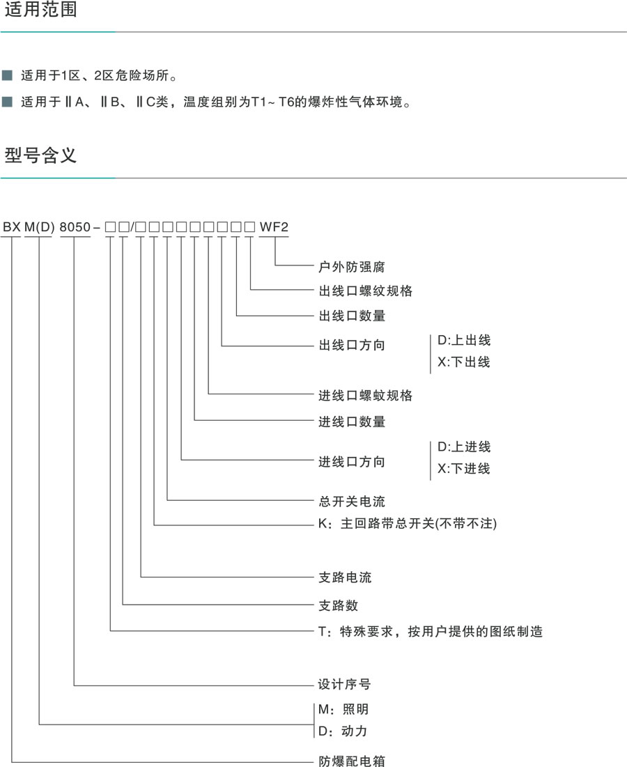 适用于1区、2区危险场所。 适用于ⅡA、ⅡB、ⅡC类,温度组别为T1~T6的爆炸性气体环境。