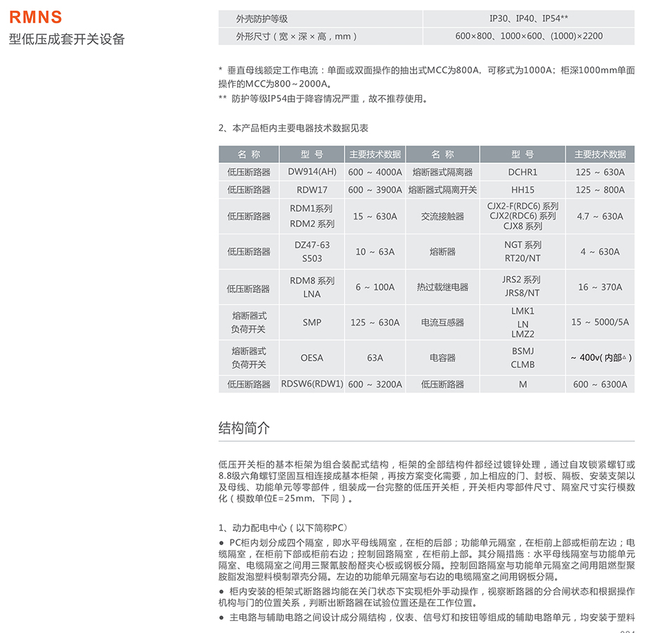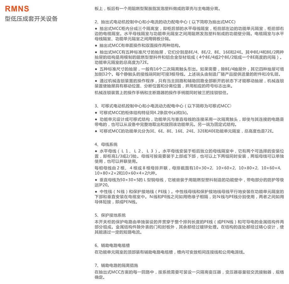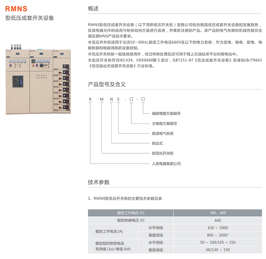 RMNS型低压成套开关设备(以下简称低压开关柜)是我公司结合我国低压成套开关设备的发展趋势,在其电器元件的选用与柜体结构方面进行改进,并重新注册的产品。该产品的电气性能和机械性能完全满足原MNS产品技术要求