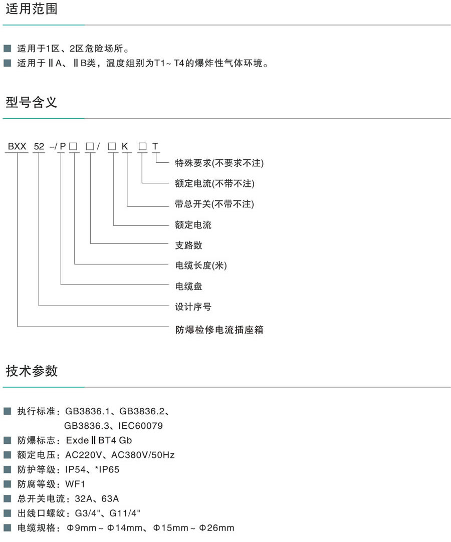 适用于1区、2区危险场所。 适用于ⅡA、ⅡB类,温度组别为T1~T4的爆炸性气体环境。