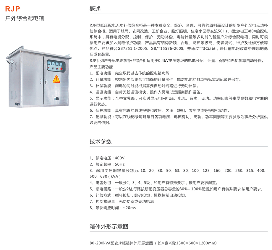 RJP型低压配电无功补偿综合柜是一种本着安全、经济、合理、可靠的原则而设计的新型户外配电无功补偿综合柜。适用于城网、农网改造、工矿企业、路灯照明、住宅小区等交流50Hz、额定电压380V的配电系统中,具有电能分配、控制、?;ぁ⑽薰Σ钩?、电能计量等多功能的新型户外综合配电箱,同时可根据用户要求加入漏电?;すδ?。产品具有结构新颖、合理、防护等级高、安装调试、维护及检修方便等优点。产品符合GB7251.1-2005、GB/T15576-2008,并通过了3C认证,是目前电网改造中理想的低压成...