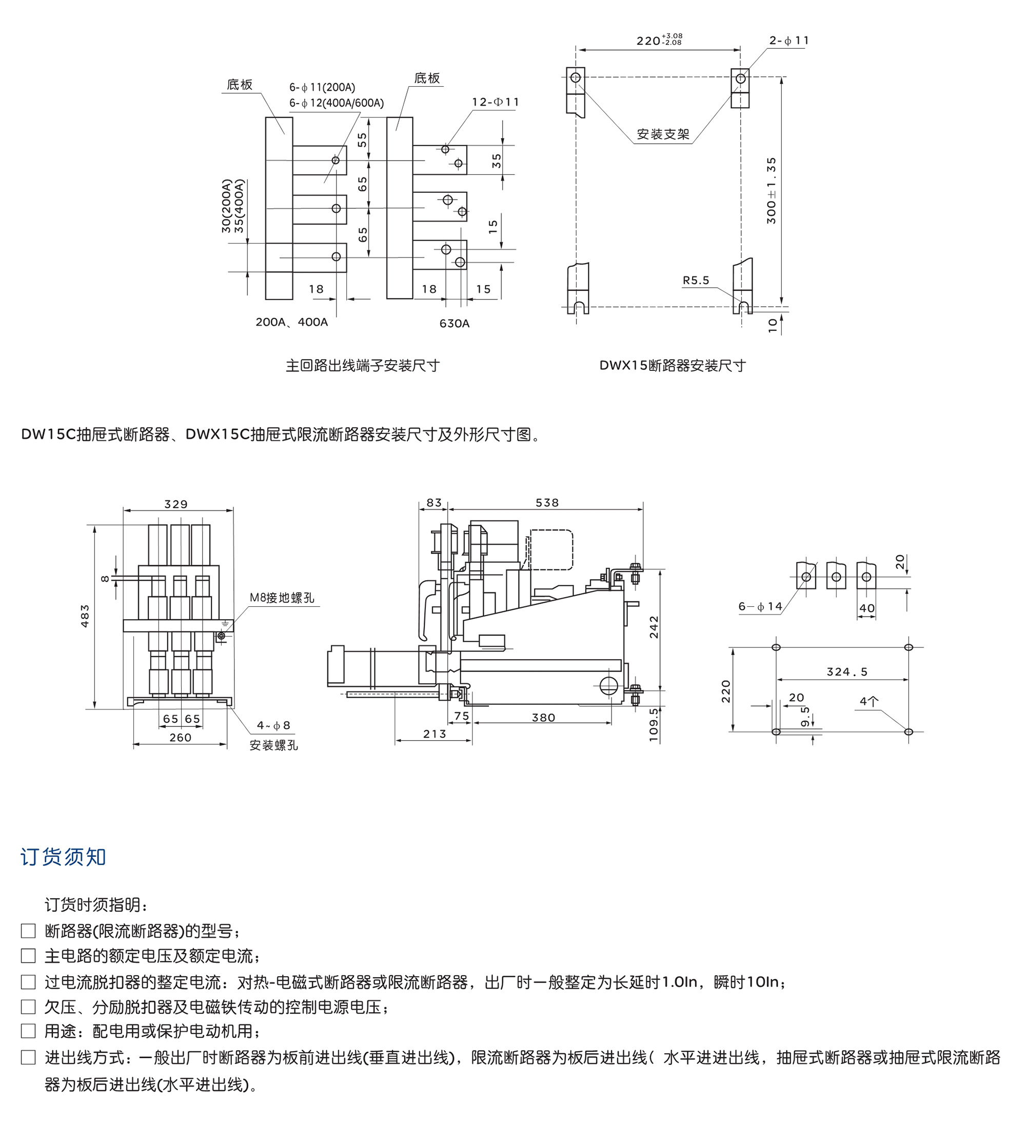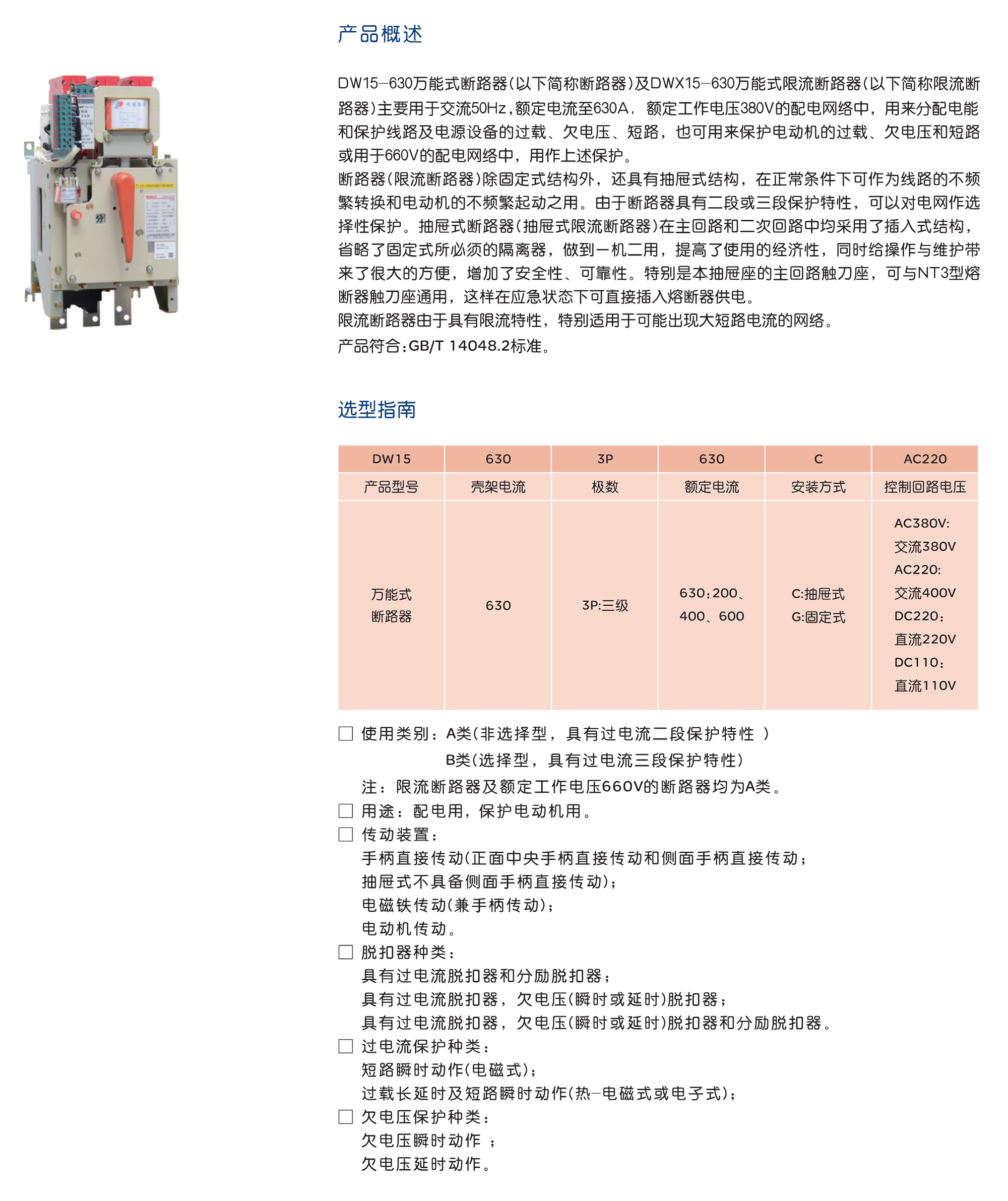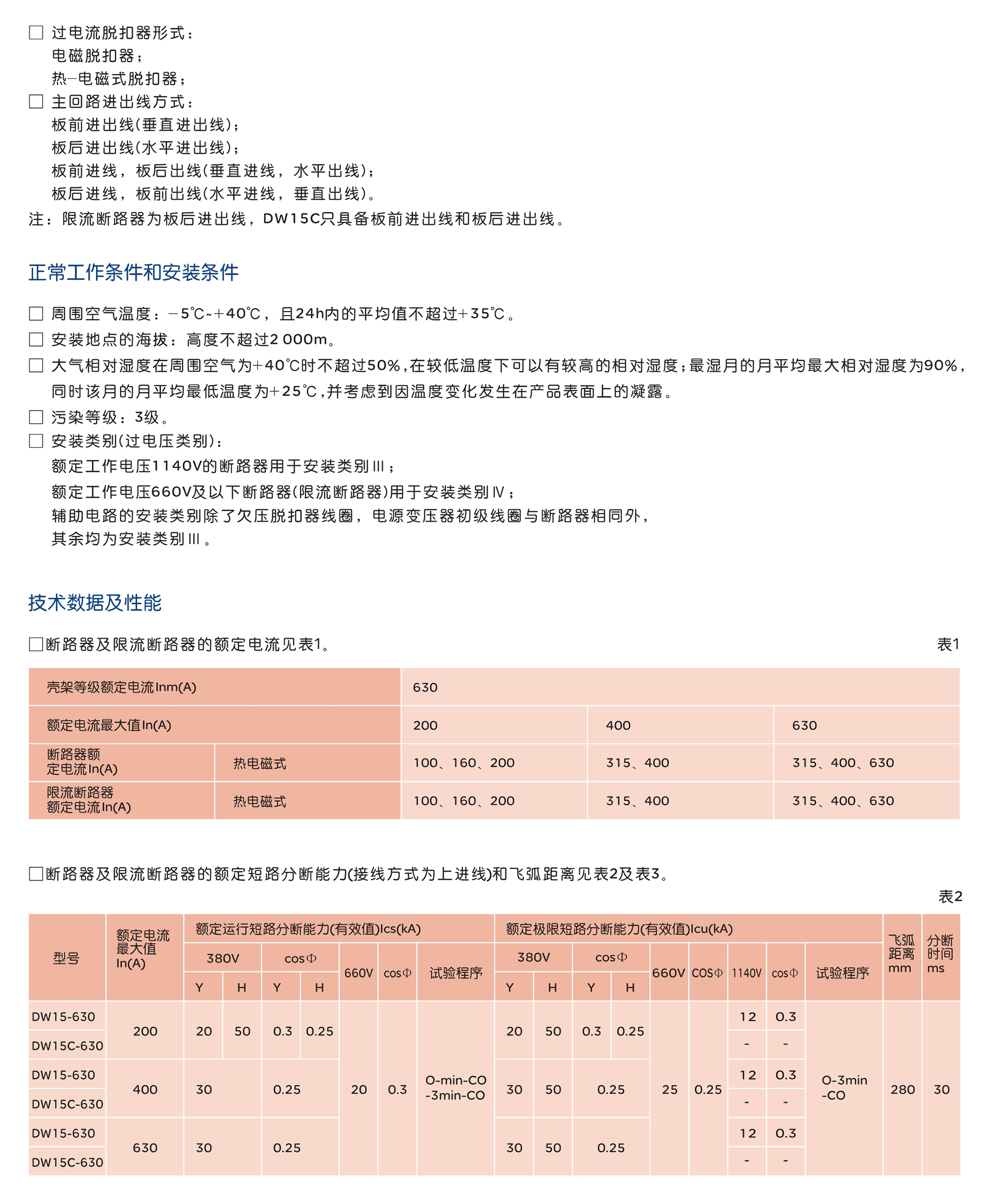DW15-630万能式断路器(以下简称断路器)及DWX15-630万能式限流断路器(以下简称限流断路器)主要用于交流50Hz额定电流至630A,额定工作电压380V的配电网络中,用来分配电能和?;は呗芳暗缭瓷璞傅墓?、欠电压、短路,也可用来保护电动机的过载、欠电压和短路或用于660V的配电网络中,用作上述?;?。此外断路器还可以用于1140的配电网络,作上述?;?