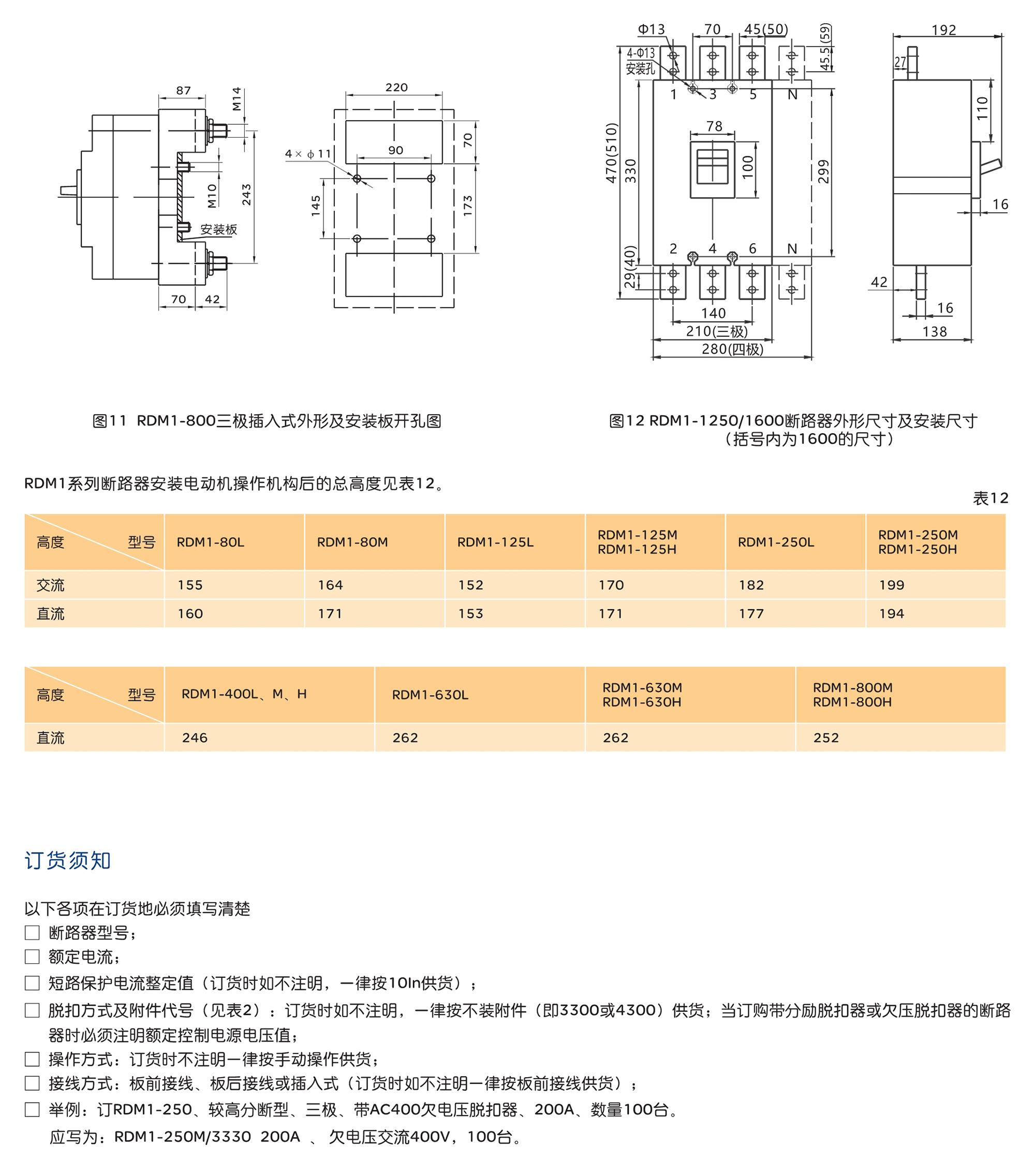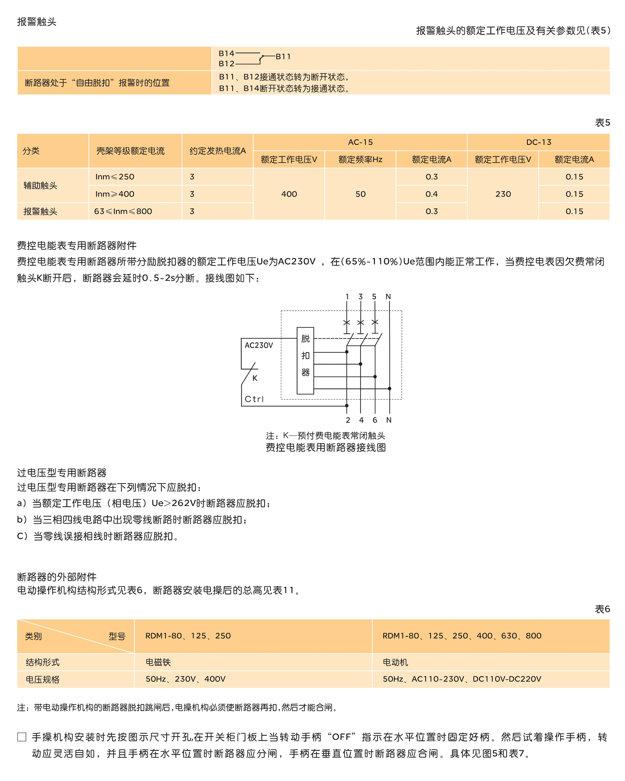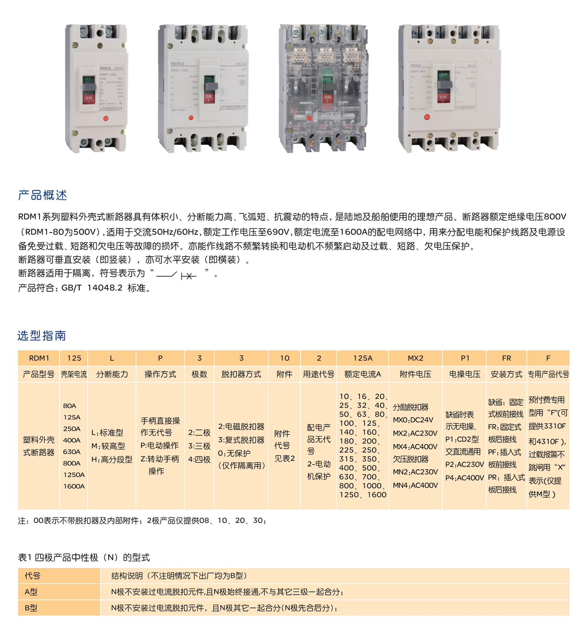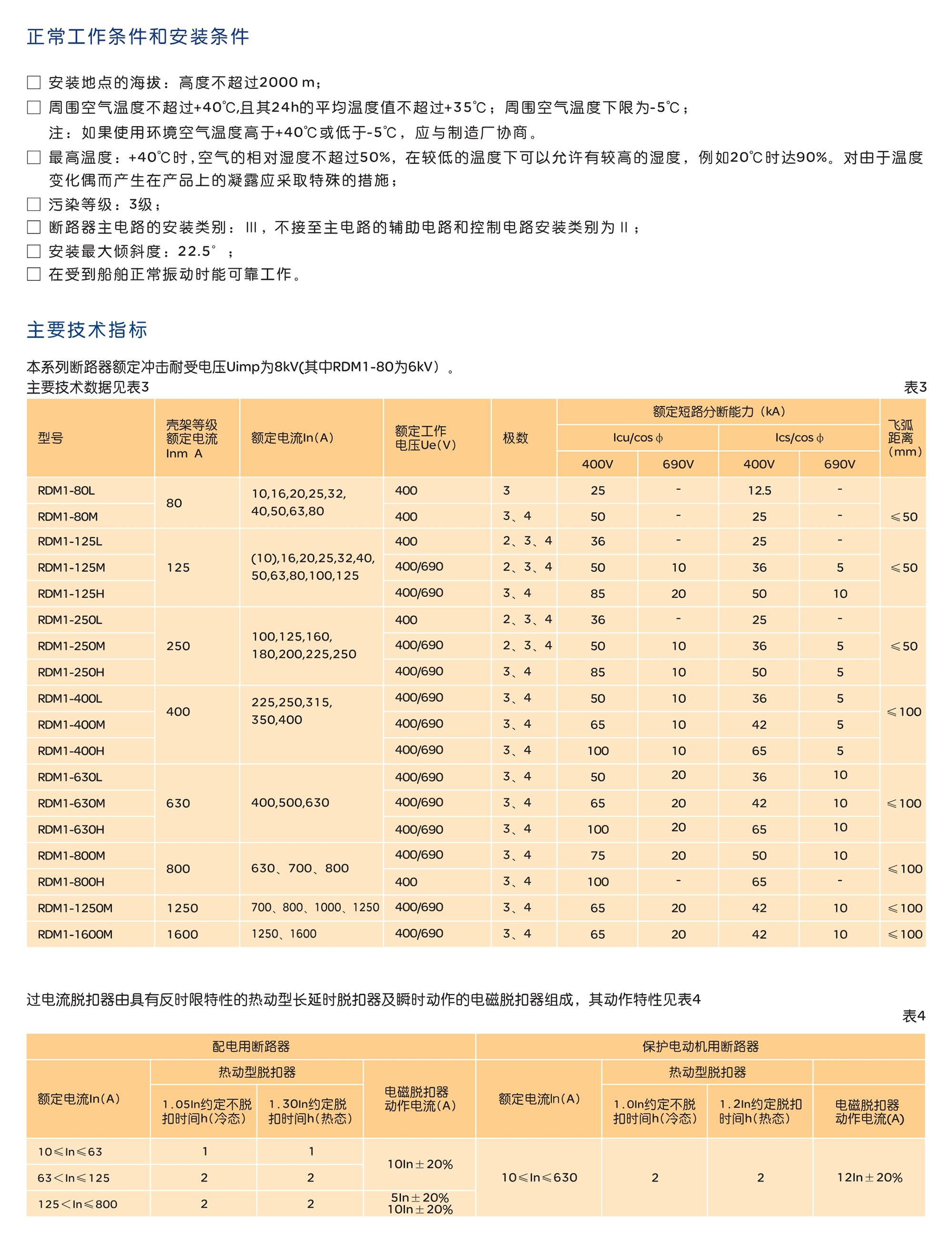 RDM1系列塑料外壳式断路器具有体积小、分断能力高、飞弧短、抗震动的特点, 是陆地及船舶使用的理想产品。断路器额定绝缘电压800V(RDM1-80为500V),适用于交流50Hz/60Hz,额定工作电压至690V,额定电流至1250A的配电网络中,用来分配电能和?;は呗芳暗缭瓷璞该馐芄?、短路和欠电压等故障的损坏。亦能作线路不频繁转换和电动机不频繁启动及过载、短路、欠电压?;?。