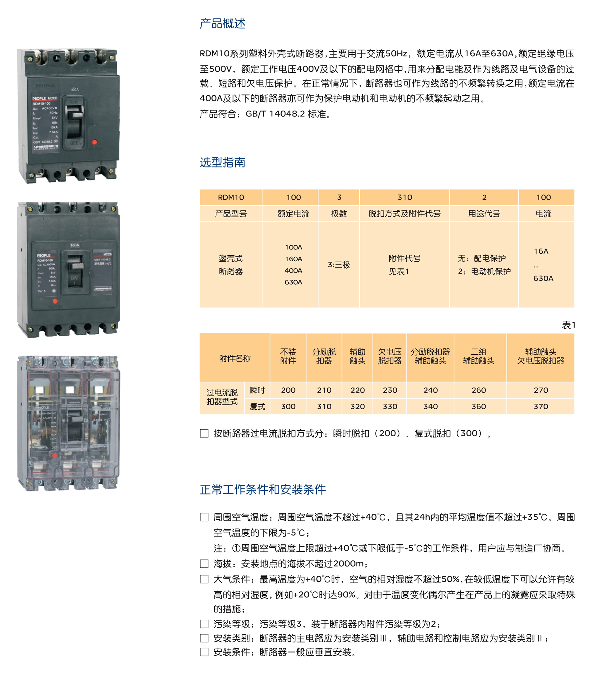 RDM10系列塑料外壳式断路器,主要用于交流50Hz,额定电流从16A至630A,额定绝缘电压至500V,额定工作电压400V及以下的配电网格中,用来分配电能及作为线路及电气设备的过载、短路和欠电压?;?。在正常情况下, 断路器也可作为线路的不频繁转换之用,额定电流在400A及以下的断路器亦可作为?;さ缍偷缍牟黄捣逼鸲谩? 产品符合:GB/T 14048.2 标准。