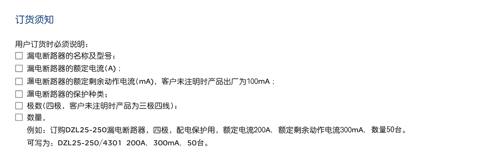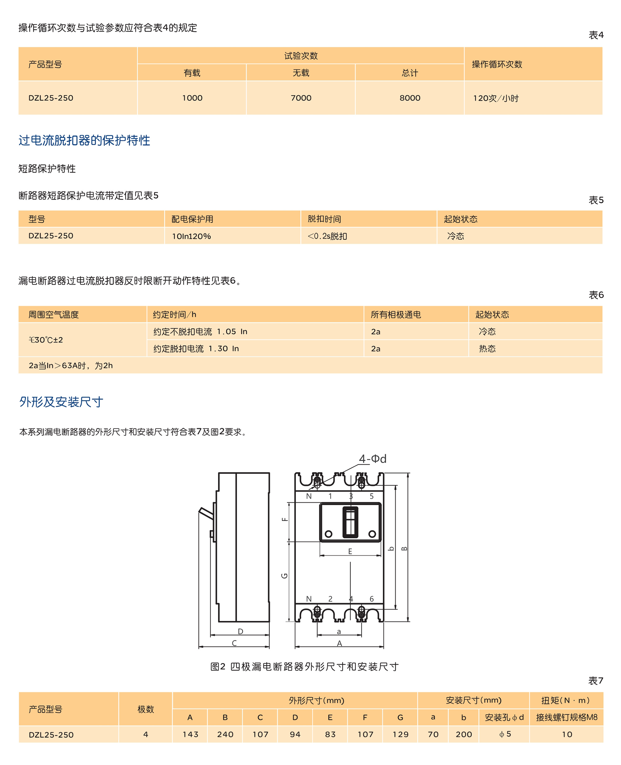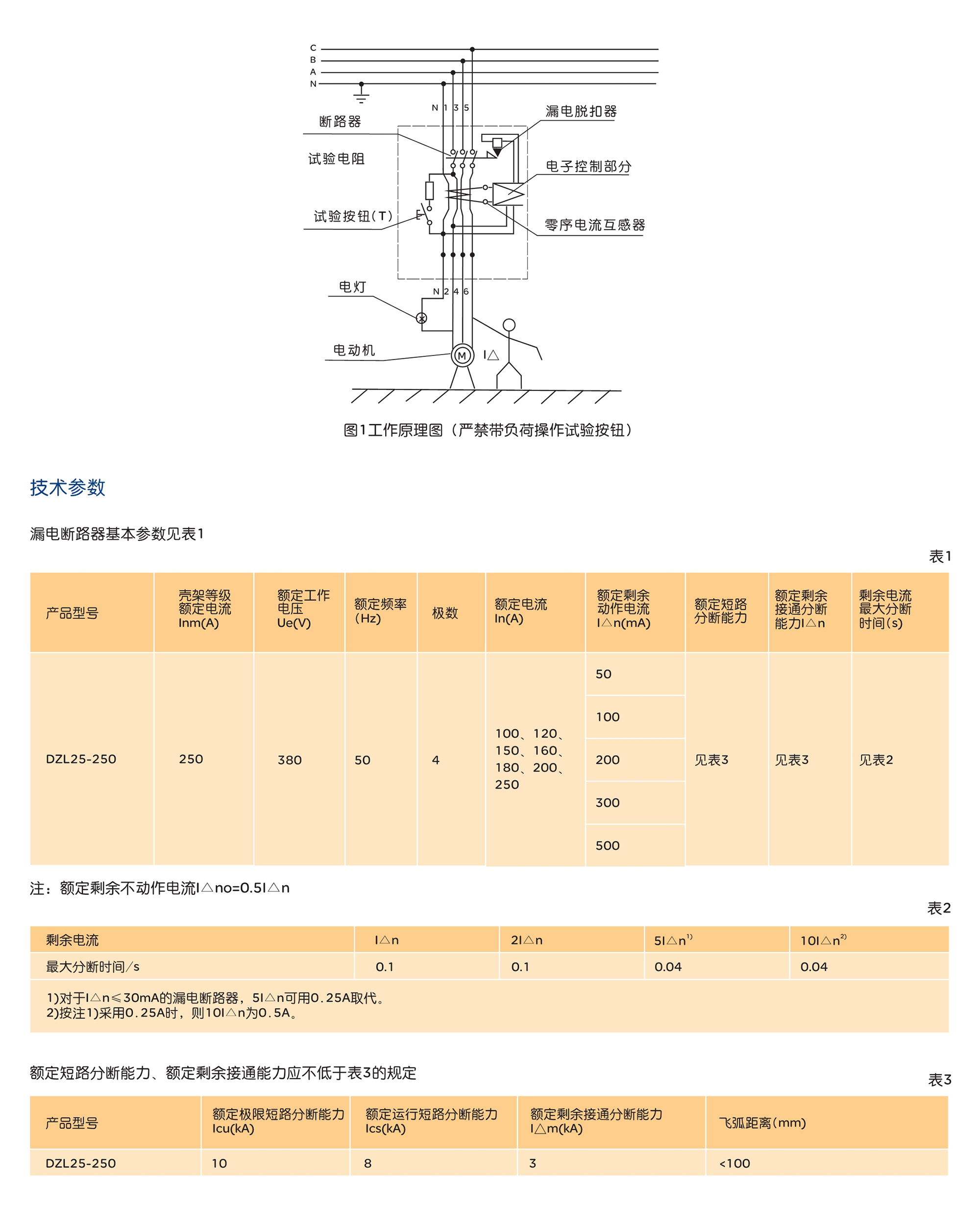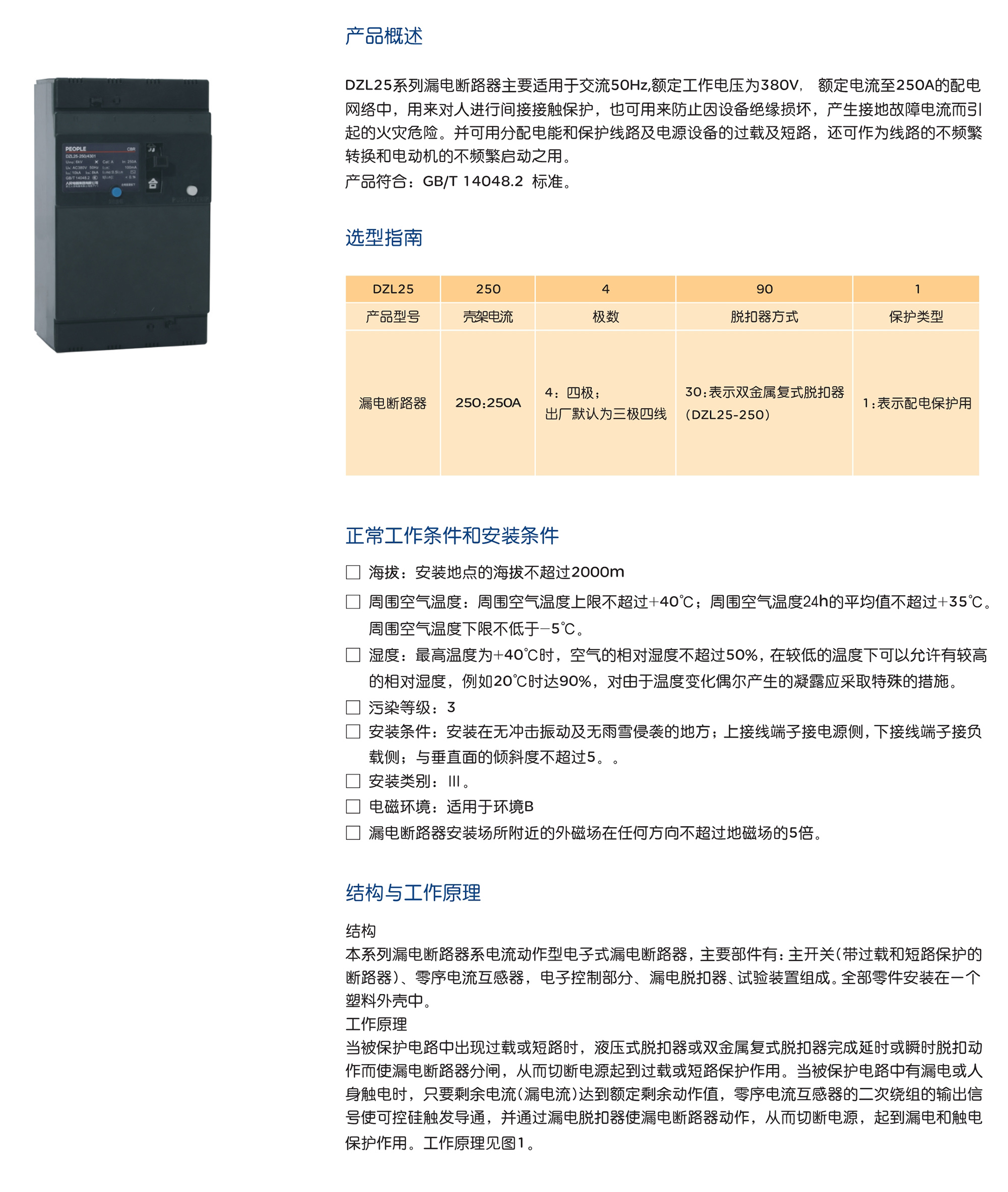 DZL25系列漏电断路器主要适用于交流50Hz,额定工作电压为380V, 额定电流至250A的配电 网络中,用来对人进行间接接触保护,也可用来防止因设备绝缘损坏,产生接地故障电流而引 起的火灾危险。并可用分配电能和保护线路及电源设备的过载及短路,还可作为线路的不频繁 转换和电动机的不频繁启动之用。 产品符合:GB/T 14048.2 标准。