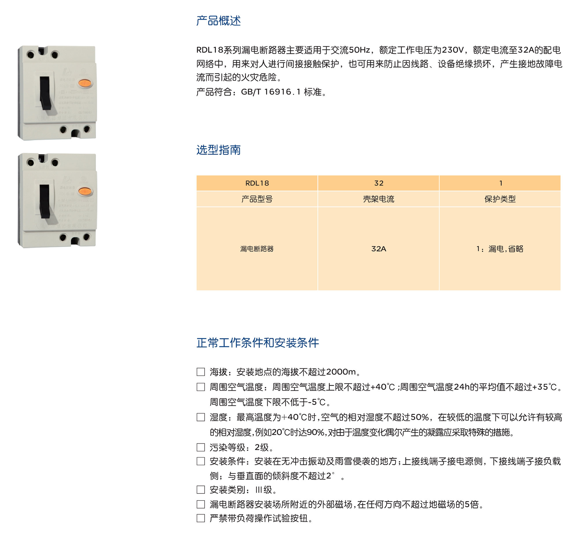 RDL18系列漏电断路器主要适用于交流50Hz,额定工作电压为230V,额定电流至32A的配电 网络中,用来对人进行间接接触保护,也可用来防止因线路、设备绝缘损坏,产生接地故障电 流而引起的火灾危险。 产品符合:GB/T 16916.1 标准。