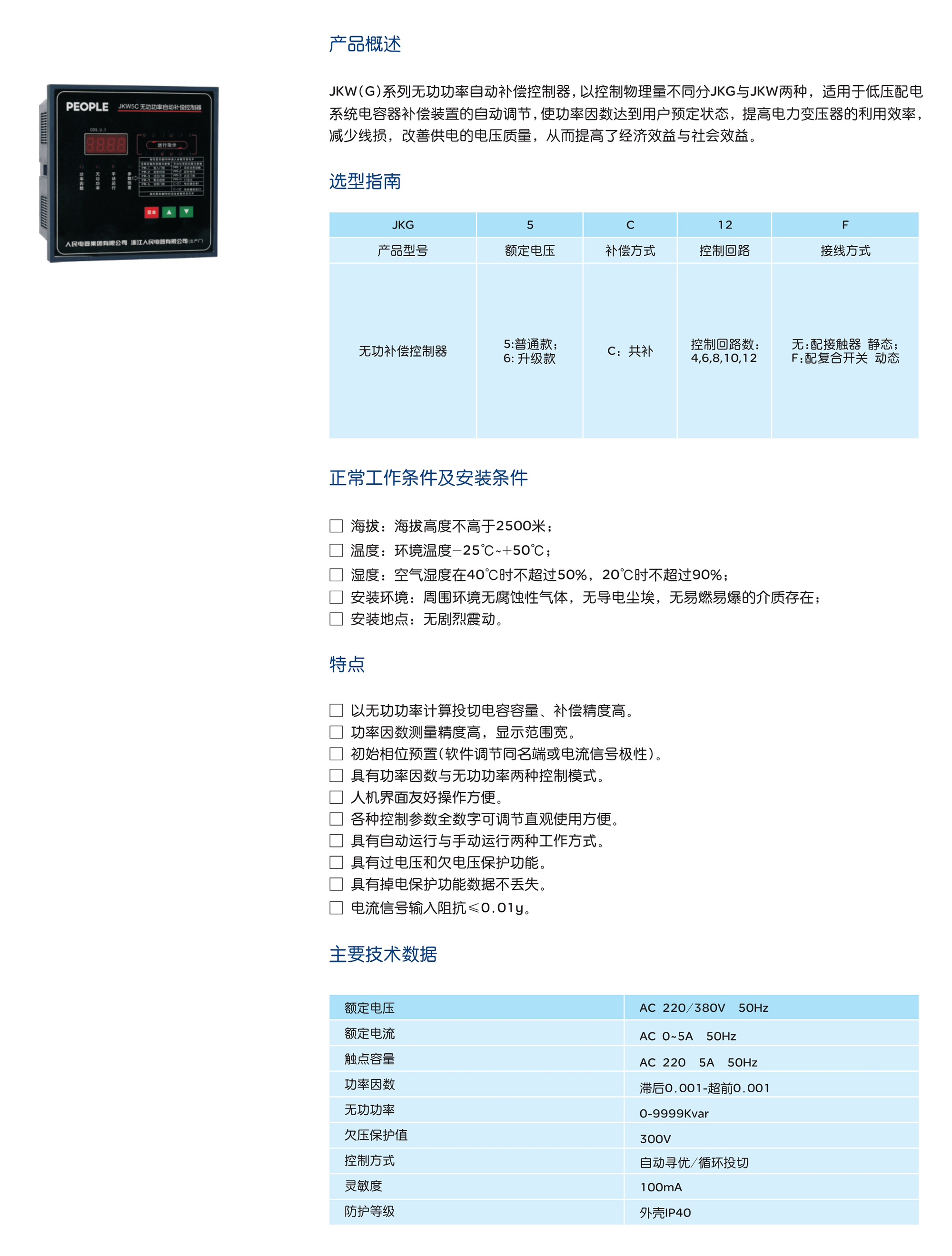 JKW(G)系列无功功率自动补偿控制器,以控制物理量不同分JKG与JKW两种,适用于低压配电 系统电容器补偿装置的自动调节,使功率因数达到用户预定状态,提高电力变压器的利用效率, 减少线损,改善供电的电压质量,从而提高了经济效益与社会效益。