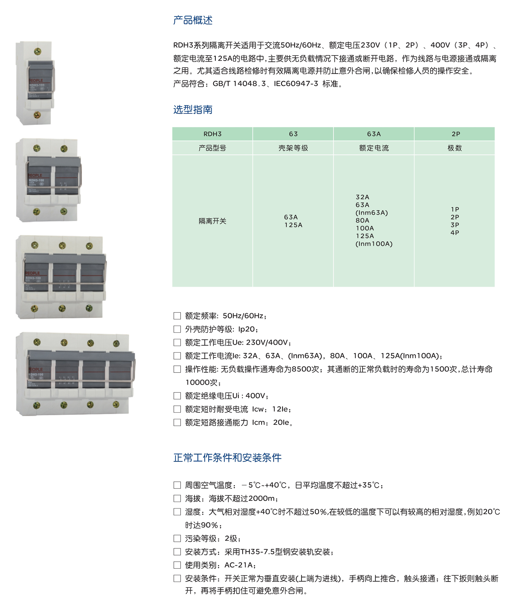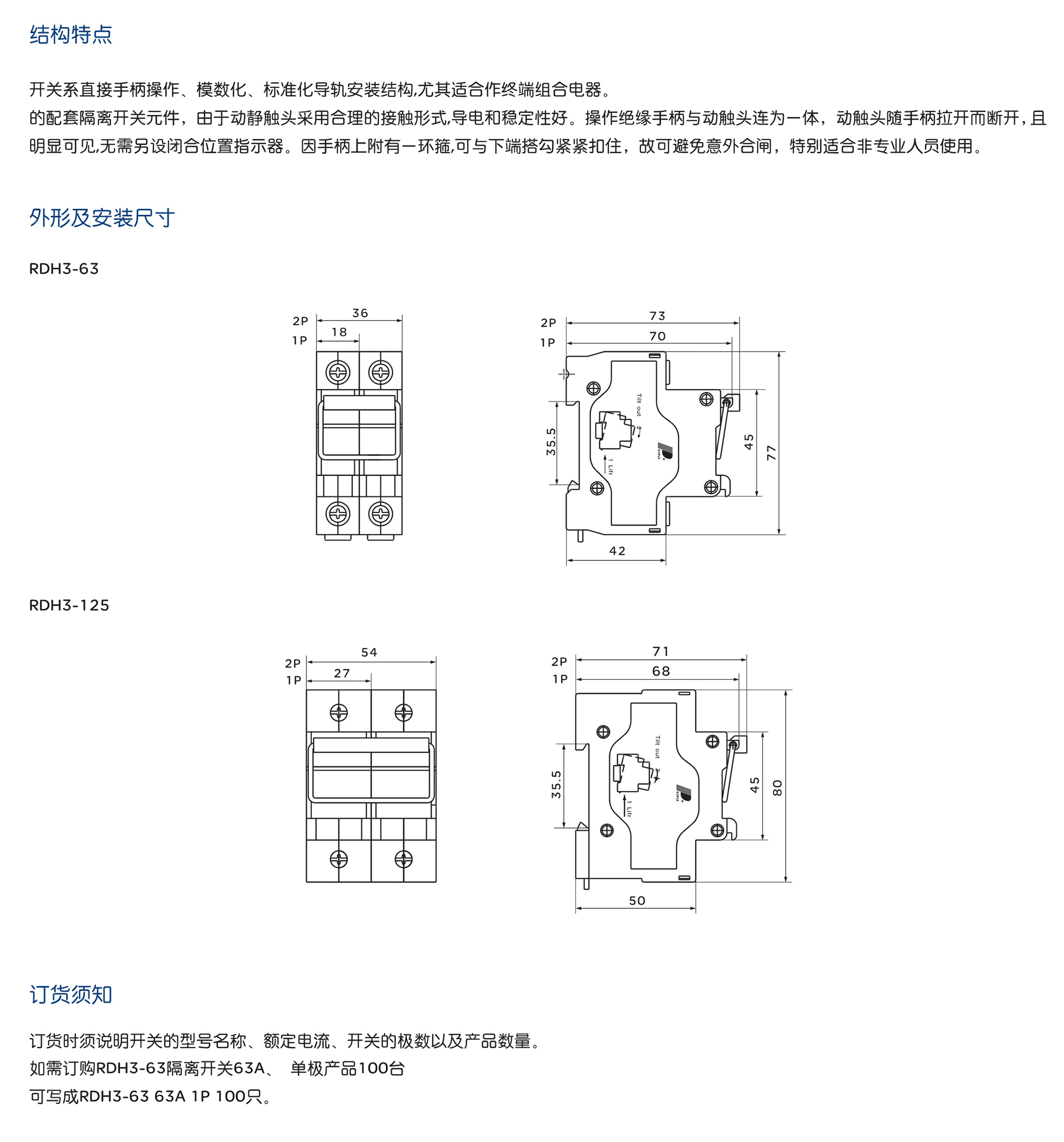 RDH3系列隔离开关适用于交流50Hz/60Hz、额定电压230V(1P、2P)、400V(3P、4P)、 额定电流至125A的电路中,主要供无负载情况下接通或断开电路,作为线路与电源接通或隔离 之用。尤其适合线路检修时有效隔离电源并防止意外合闸,以确保检修人员的操作安全。 产品符合:GB/T 14048.3、IEC60947-3 标准。