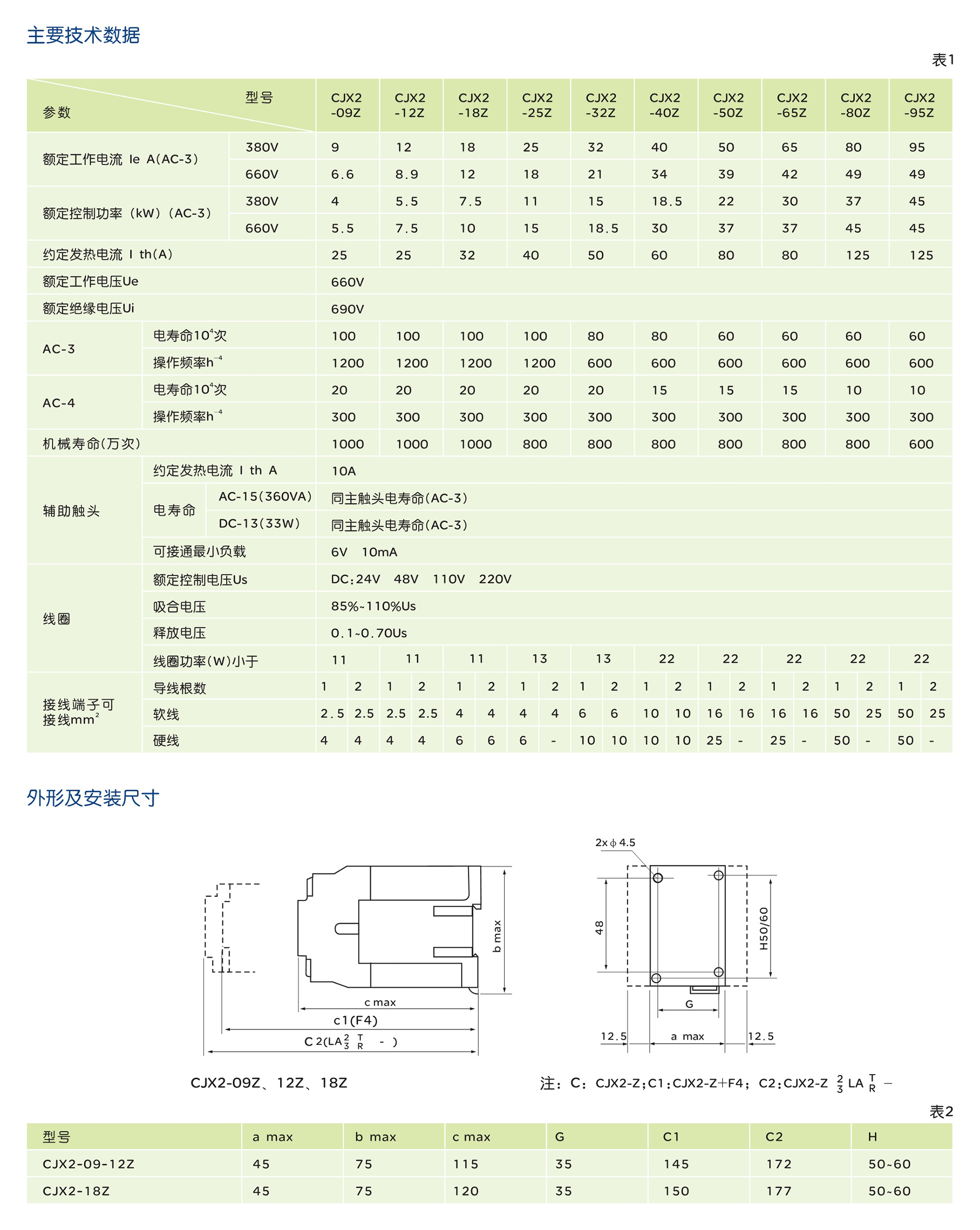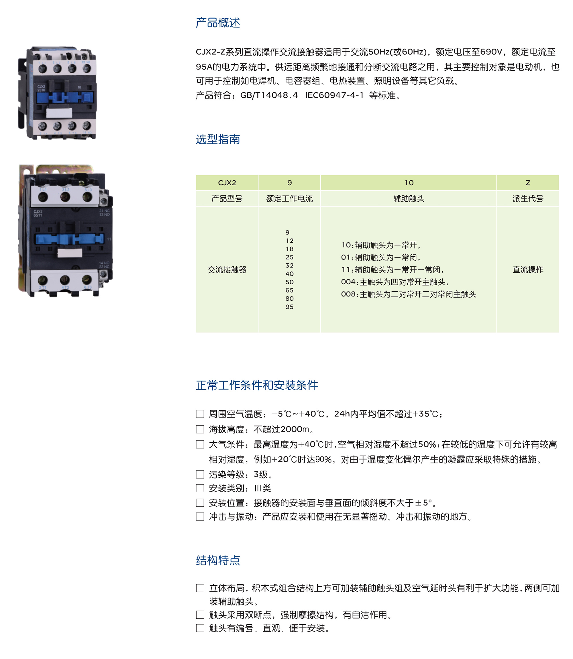 CJX2-Z系列直流操作交流接触器适用于交流50Hz(或60 z) 额定电压至690V 额定电流至 95A的电力系统中。供远距离频繁地接通和分断交流电路之用,其主要控制对象是电动机,也 可用于控制如电焊机、电容器组、电热装置、照明设备等其它负载。 产品符合:GB/T14048.4 IEC60947-4-1 等标准。