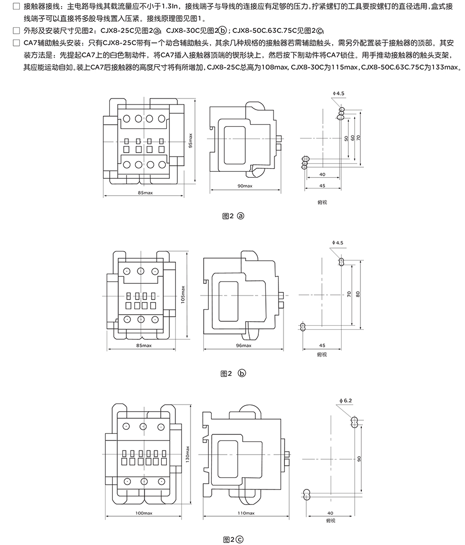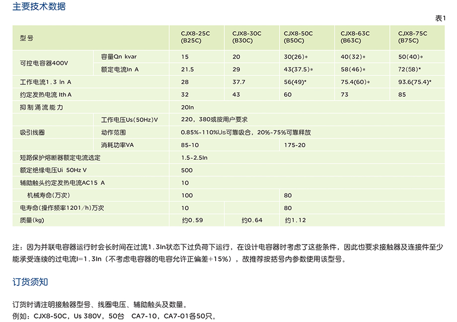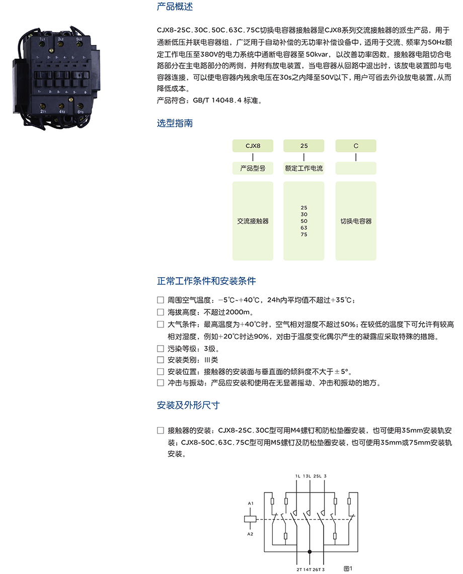 CJX8-25C.30C.50C.63C.75C切换电容器接触器是CⅨ8系列交流接触器的派生产品,用于通断低压并联电容器组,广泛用于自动补偿的无功率补偿设备中,适用于交流、频率为50Hz额定工作电压至380V的电力系统中通断电容器至50Kvar,以改善功率因数。接触器电阻切合电路部分在主电路部分的两侧,并附有放电装置,当电容器从回路中退出时,该放电装置即与电容器连接,可以使电容器内残余电压在30s之内降至50V以下,用户可省去外设放电装置,从而低成本。
