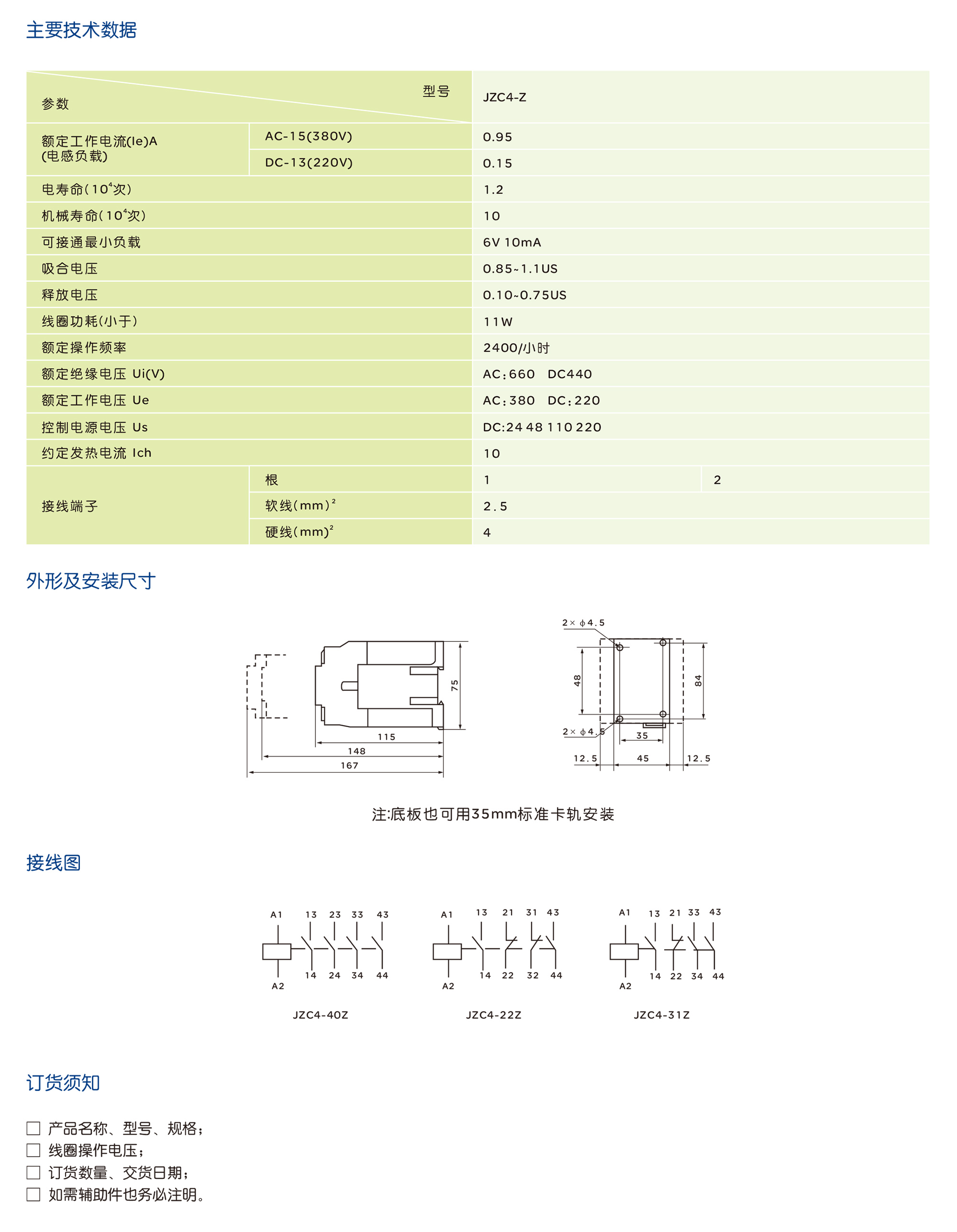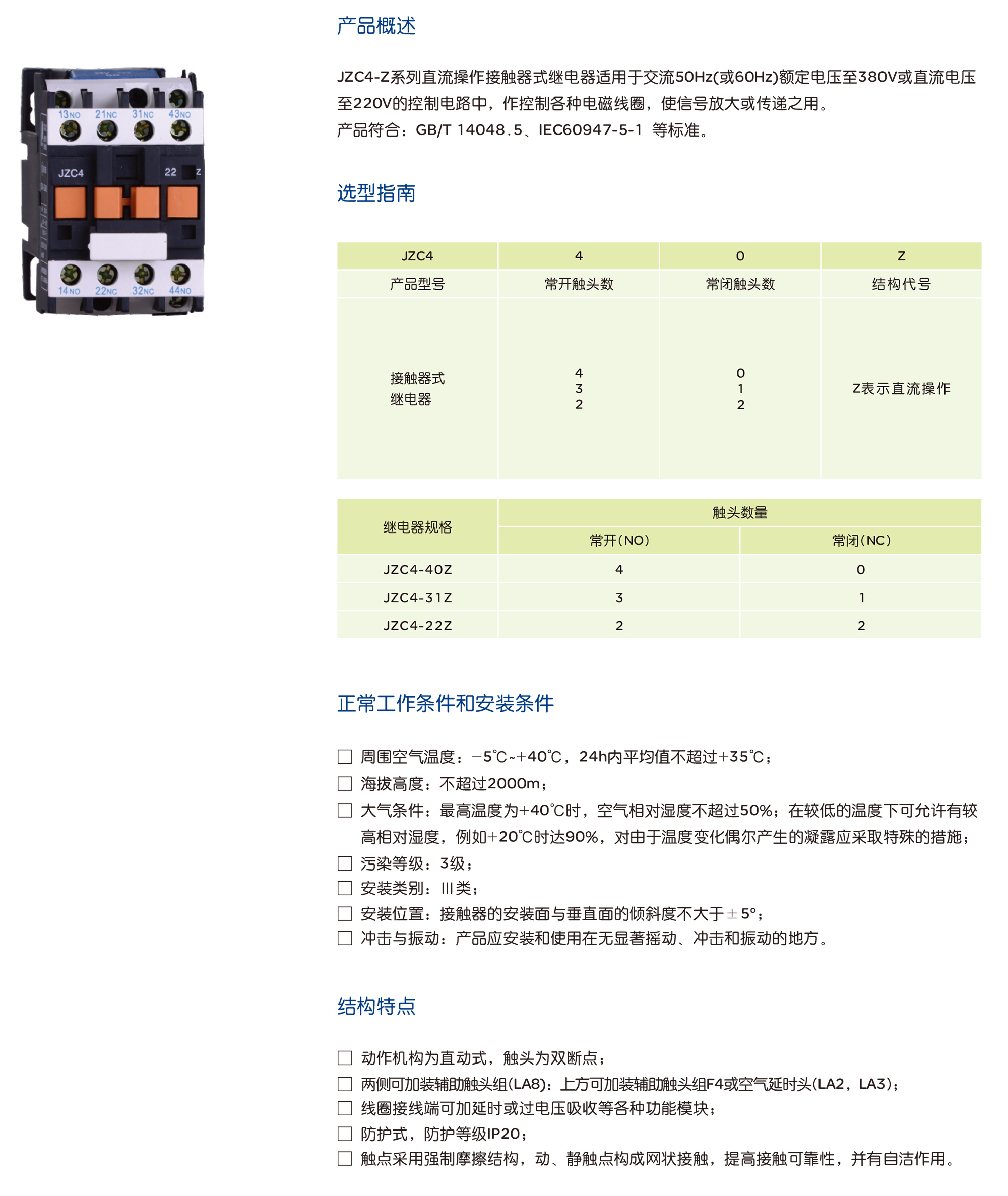 JZC4-Z系列直流操作接触器式继电器适用于交流50Hz(或60Hz)额定电压至380V或直流电压至220V的控制电路中,作控制各种电磁线圈,使信号放大或传递之用品符合:GB/T14048.5、IEC60947-5-1等标准。