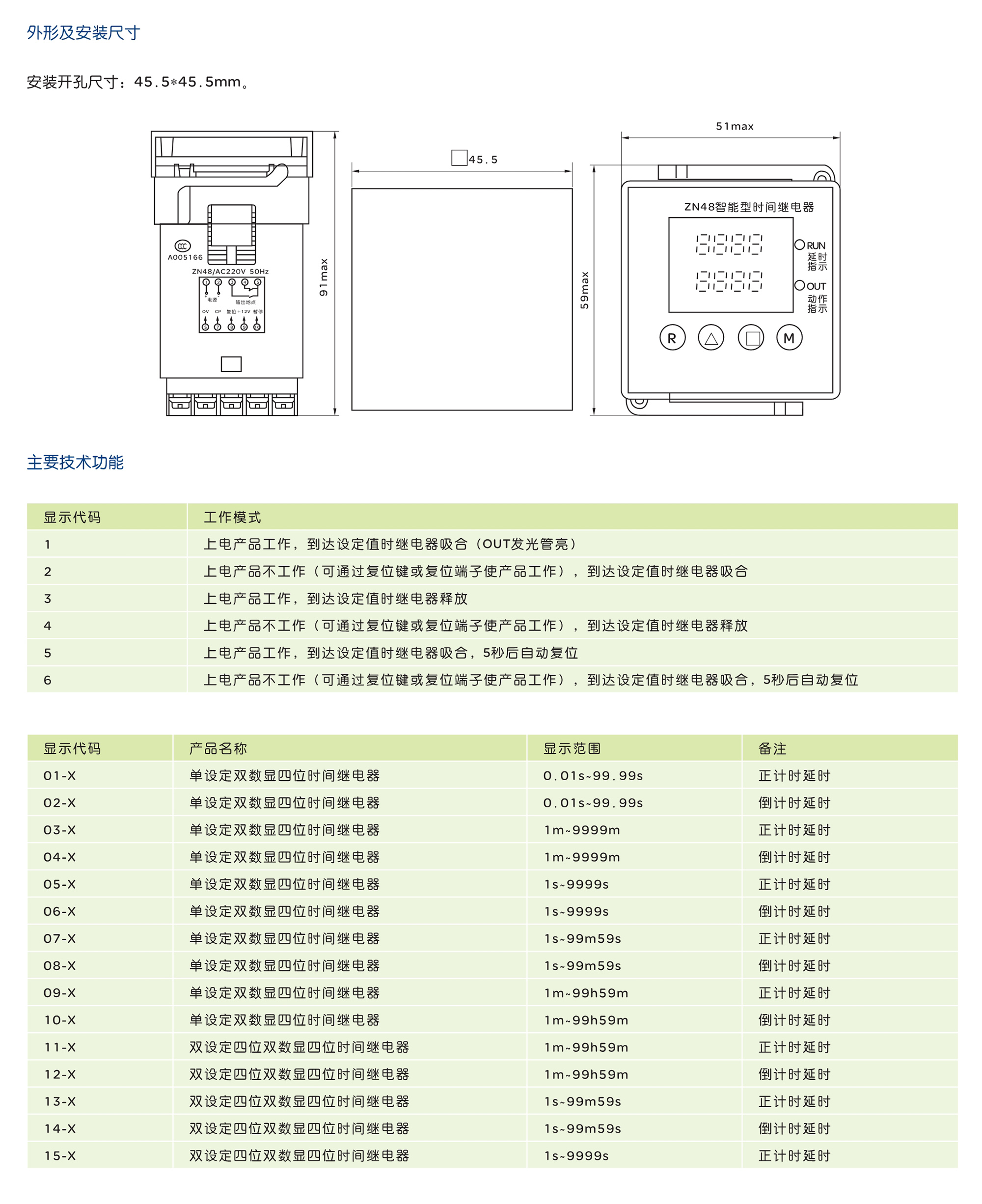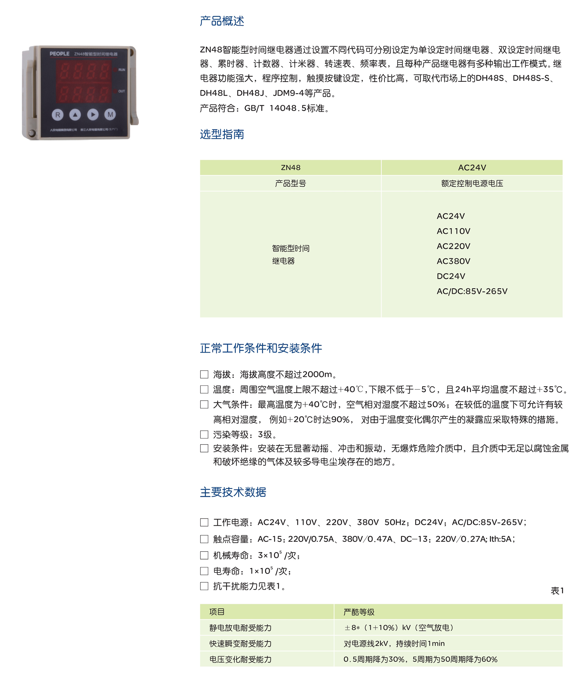 ZN48智能型时间继电器通过设置不同代码可分别设定为单设定时间继电器、双设定时间继电 器、累时器、计数器、计米器、转速表、频率表,且每种产品继电器有多种输出工作模式。继 电器功能强大,程序控制,触摸按键设定,性价比高,可取代市场上的DH48S、DH48S-S、 DH48L、DH48J、JDM9-4等产品。 产品符合:GB/T 14048.1、GB/T 14048.5、JB/T10047 标准。