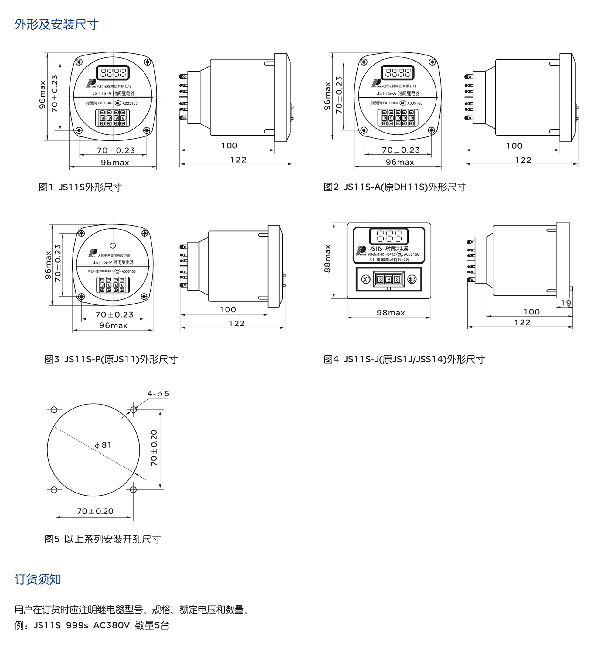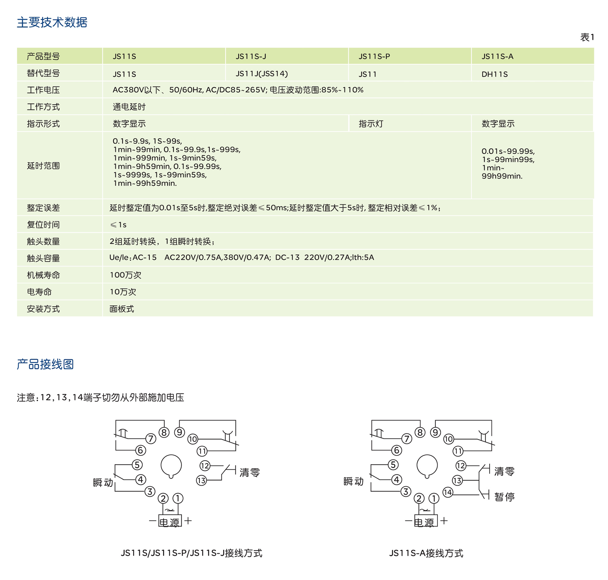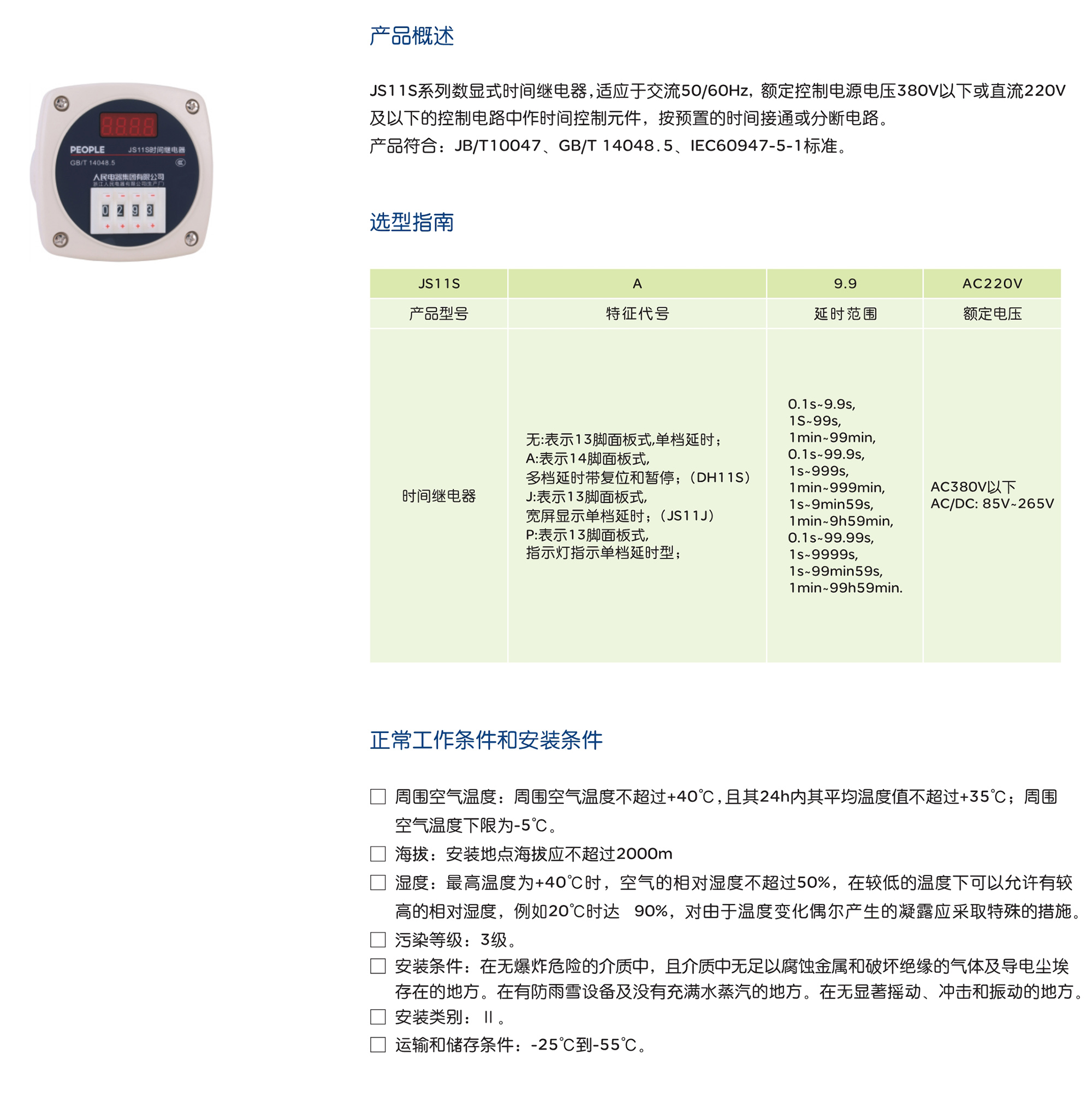 JS11S系列数显式时间继电器,适应于交流50/60Hz,额定控制电源电压380V以下或直流220V 及以下的控制电路中作时间控制元件,按预置的时间接通或分断电路。 产品符合:JB/T10047、GB/T 14048.5、IEC60947-5-1标准。